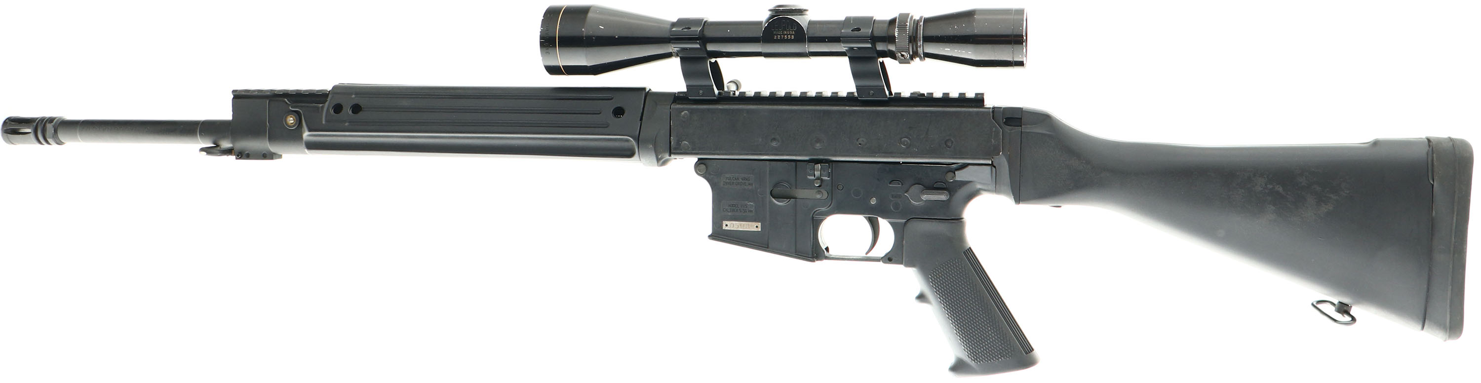 Vulcan Arms, Model: V15 Polymer Series, Cal: 5.56mm NATO, MFG: Modern, S/N: 05080, Semi-auto rifle, 20'' barrel,1:7 Twist. 21 1/2'' with muzzle brake. Polymer lower. The fixed black polymer stock, checkered pistol grip & forend are excellent. The metal finishes rate 95% overall. The receiver carries a Leupold gold ring Vari-X II 3X9 scope mounted on a 8'' picatinny rail. Bore is excellent. The forend/barrel is fitted with a 3'' accessory picatinny rail & sling loop. The stock carries a solid rubber recoil pad & sling loop. No mag. FFL Req. - Value: 400 to 600