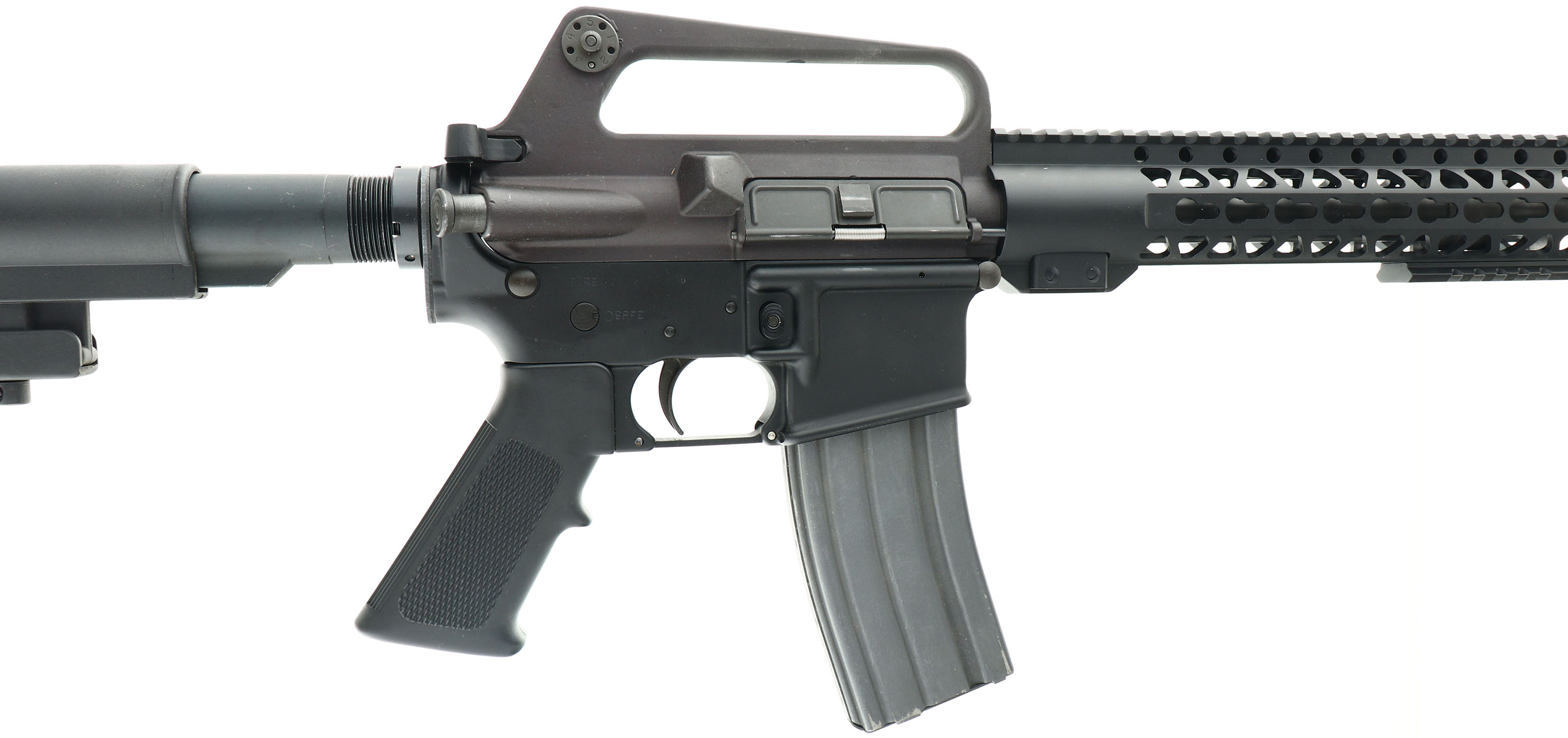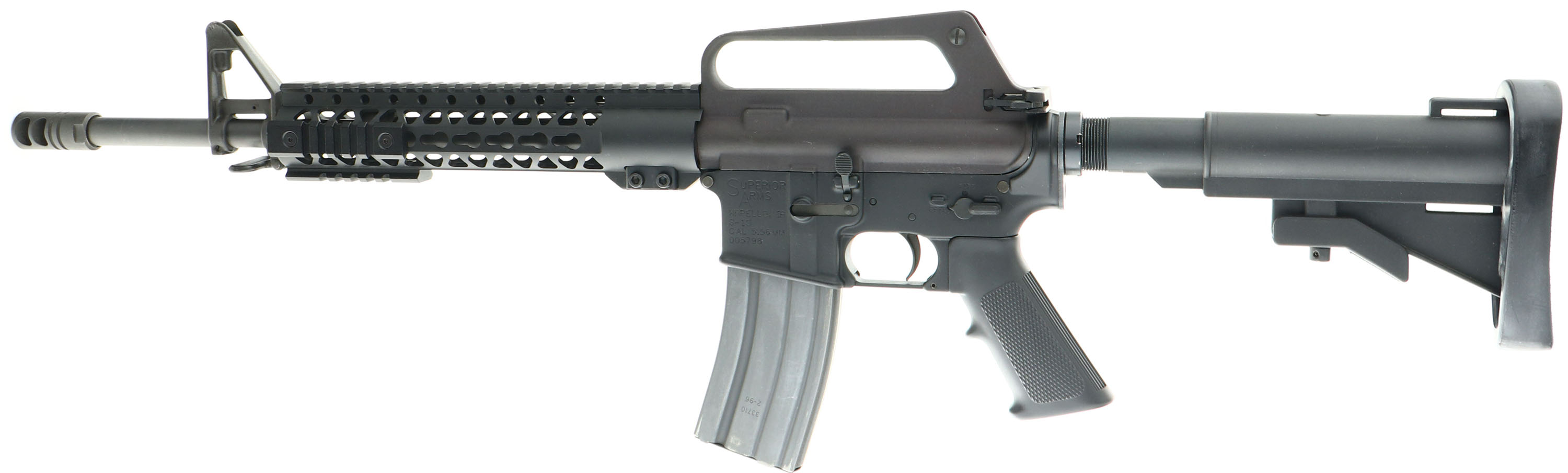 Superior Arms, S-15, CAL: .300 Blackout, MFG: Modern, SN: 005798, Semi Auto Rifle, 16'' barrel, 17 1/2'' with muzzle break. The synthetic checkered pistol grip & 6pt telescoping stock are excellent. The 10'' octagon key-mod handgaurd is excellent, with 10'' picatinny rail on top & 3 1/2'' rails on the bottom & left side. The matte black finish rates 99%overall. Bore is excellent. The receiver carries the fixed A1 carry handle, with height adjusting rear sight. A2 style front sight gas block assembly. Sling loop. 30rnd steel mag. FFL Req. - Value: 400 to 800