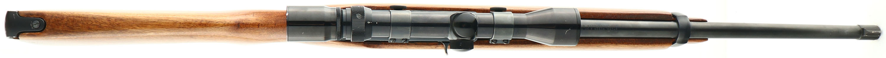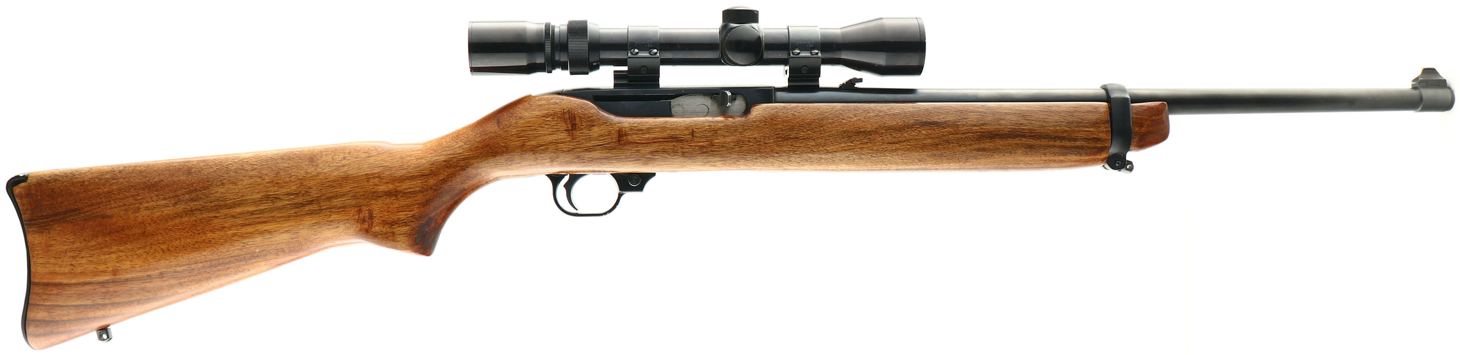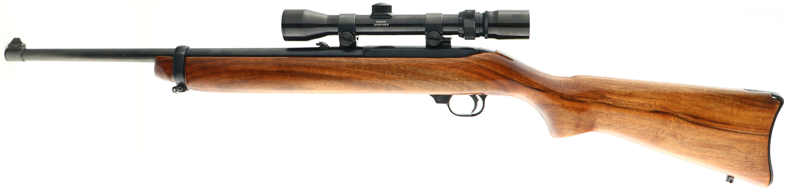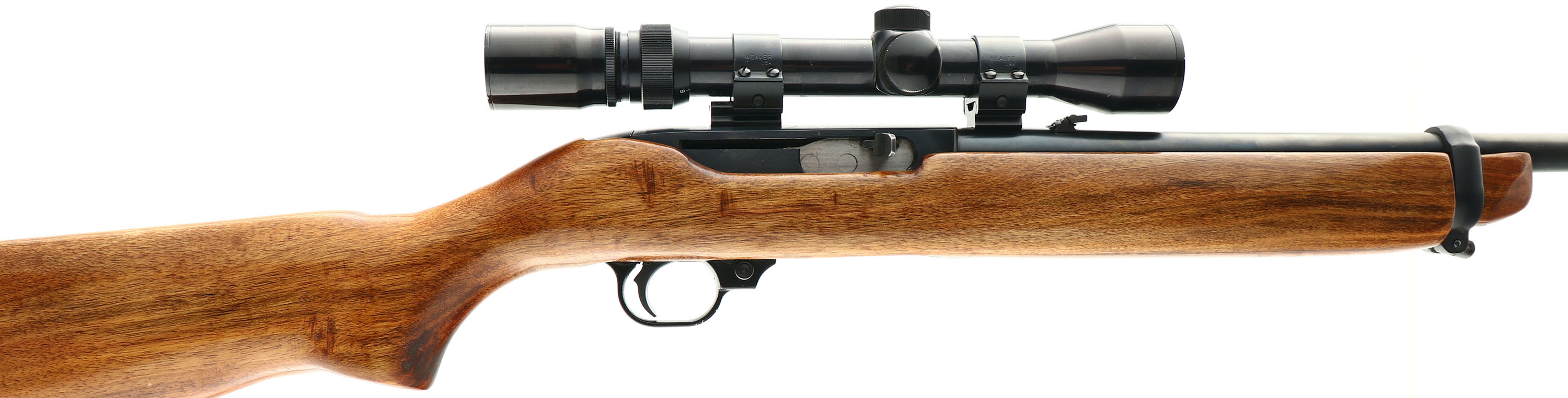 Ruger, Model Carbine 44, 44 Magnum Cal., MFG. 1973, SN: 100-37410, Semi-Autoloading Rifle, 18 1/2'' Round barrel. Tubular mag. The original flat pistol grip wood stock is very good, as sanded & refinished, with minor to small scrapes, scratches & contusions remaining under the high gloss refinish. The original metal blue finish rates 95% overall. Bore is excellent. The receiver carries a Bushnell Sportview 3-9 scope on Weaver mounts, while the barrel carries a folding leaf rear & standard front sights. Stock carries the factory carbine style metal buttplate. Sling studs. FFL or C&R Req. - Value: 400 to 800