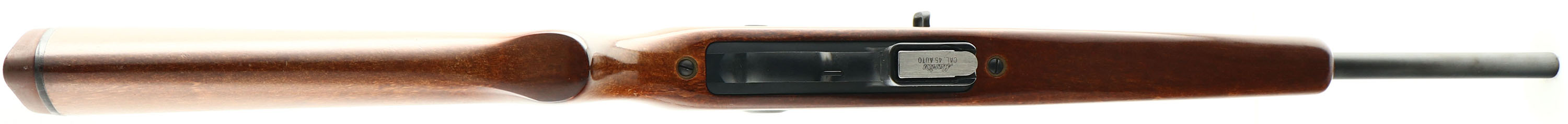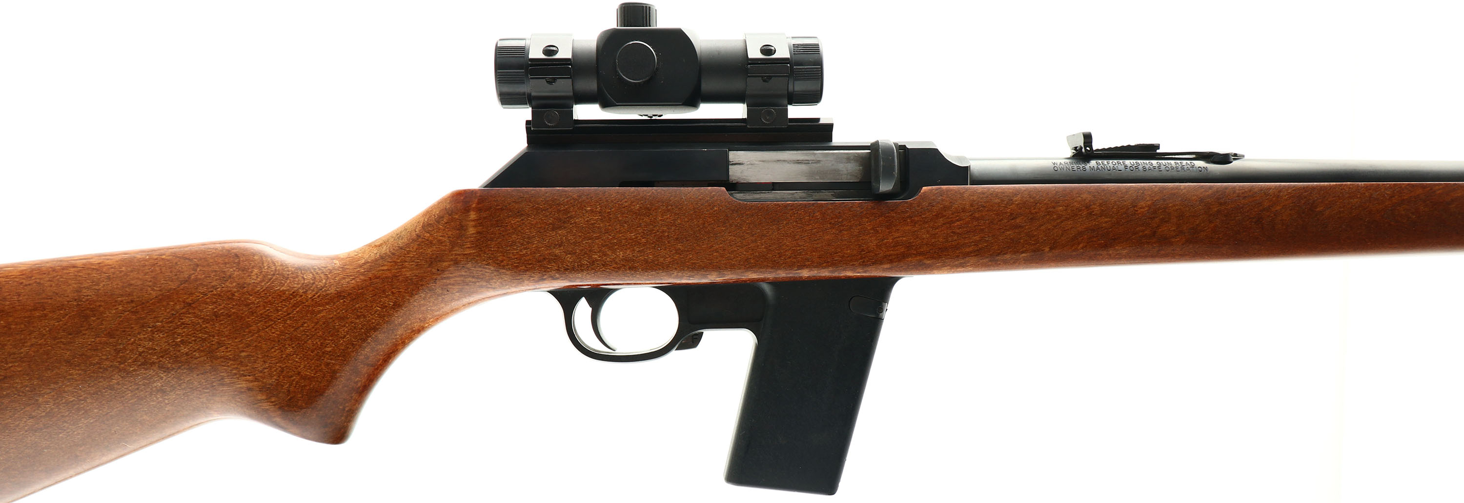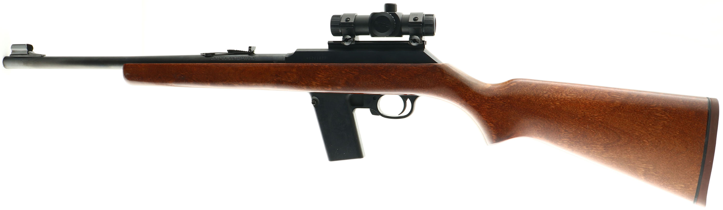 Marlin, Model 45 ''Camp Carbine'', CAL: 45 ACP, MFG: Modern, SN: 45001627, Semi Auto Rifle, 16 1/2'' barrel. The original flat pistol grip stock is excellent, with few tiny handling marks to the original finish, which is thinning a bit at the top of the wrist. The metal blue finish on the barrel rates 99% overall. Bore is excellent. The receiver carries a BEC INC. Miradot 1X20mm scope, while the barrel carries an adjustable rear & hooded blade front sights52. Stock carries a Marlin solid recoil pad. Comes with a Marlin marked detachable mag, but will fit any standard sized 7 or 7+ round M1911 single stack mag. FFL Req. - Value: 600 to 1000