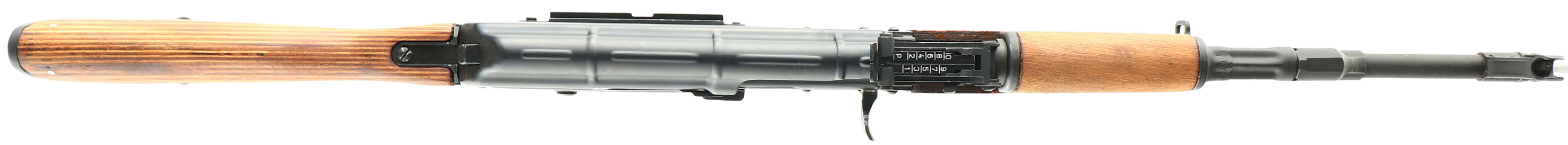 CN Romarm SA (Cugir Arms Factory in Romania) CAI import, Model: GP-WASR-10/63, Cal: 7.62x39mm. MFG: 1986 (parts kit date), S/N: SBO-0362-86, Semi-auto Rifle, 16 '' barrel. These rifles were made in Romania in a sporter configuration (Single stack mag wells, bores not fully rifled/bored, & alternate stock sets, Etc). CAI Re-configured them when they were imported to the classic AK Look. Some of the modifications appear rough but the rifle is fully functionable. The Laminated wood stock set is excellent with only light handling wear, the wood is unfinished. The black phosphate finish rates 90% with light scuffs, scratches & wear. The left side of the receiver is marked with the model & caliber, the right side is marked with MFG & import info. Left side of the receiver has a Russian optic mount. It has a Tapco Hammer & trigger, single stage trigger with Approx. 4lbs Pull. The bore is very good. Its bright with spots of light roughness in the grooves. Chrome lined bore. The muzzle device is spot welded into place. The barrel holds a post front sight with protective wings. Rear sight is a Tangent U-notch marked 1 to 10 with a rear battle Zero marked ''P''. The buttstock carries a steel trapdoor buttplate, nothing inside the stock. Rifle has a cleaning rod, & comes with one 30rd Mag. FFL Req. - Value: 600 to 1200
