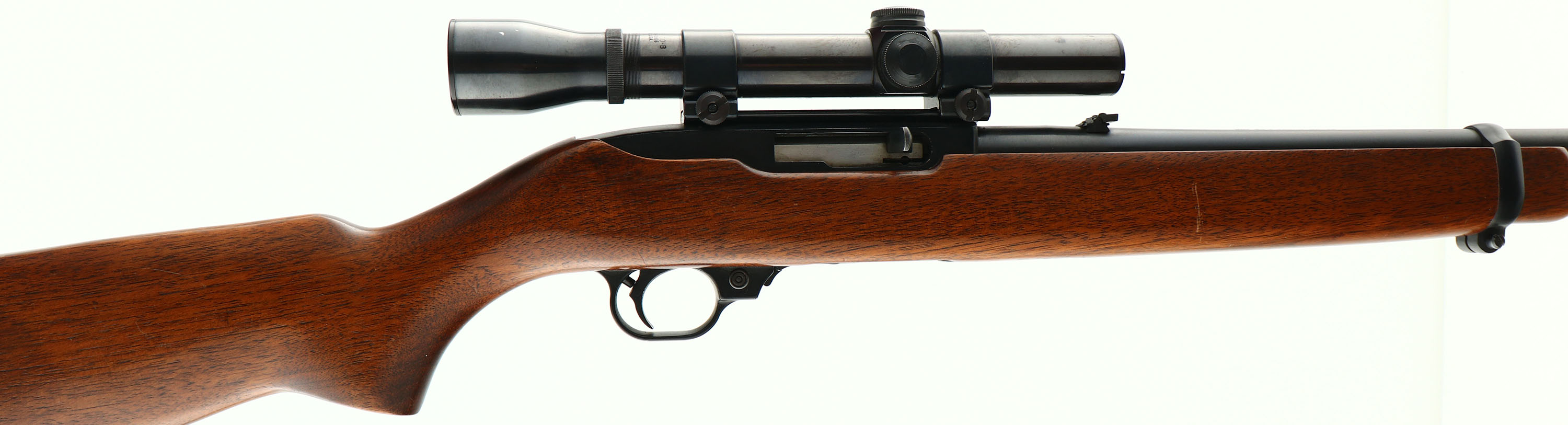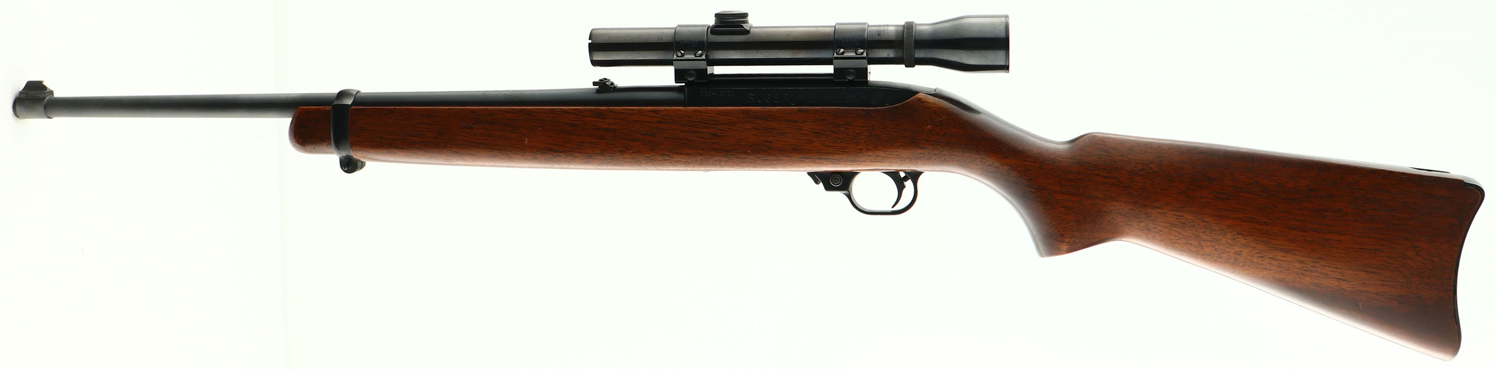 Ruger, Model 10/22 Carbine, CAL: 22 LR, MFG: 1971, SN: 110-72710, Semi Auto Rifle, 18 1/2'' barrel. The flat pistol grip wood stock is excellent, but with a few minor scratches & contusions to the excellent original finish . The metal blue finish rates 95%. Bore is excellent & bright. The receiver carries a Weaver K25 60-B scope on Weaver 1'' rings. The barrel holds a standard folding leaf rear sight & blade front sight. Buttstock carries a smooth metal buttplate. Comes in original red & black Ruger 10/22 zipper scabber. FFL or C&R Req. - Value: 250 to 500