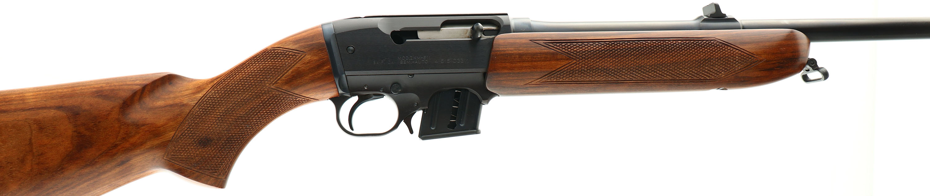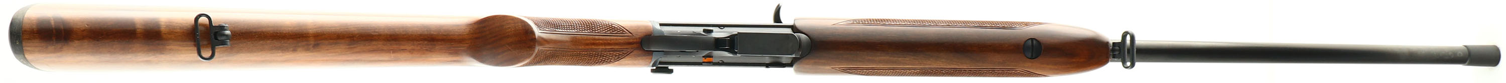 Brno Arms, Model ZKM-611, .22 WMR Cal., MFG. 1995, SN: 451503311, Semi-Autoloading Rifle, 20 1/2'' Round barrel. Detachable mag. The original checkered & flat pistol grip wood stocks are excellent & solid, with excellent original factory finish & few minor scuffs & scratches. The original metal blue finish is 98%. The top of receiver is rail grooved for scope mounts, but there is also three screw filled holes from previous scope mounting. Barrel fitted with fixed open sights. Bore is excellent. Stock carries a factory checkered black plastic buttplate. Factory sling swivels. An overall excellent semi-auto rifle. FFL Req. - Value: 300 to 600