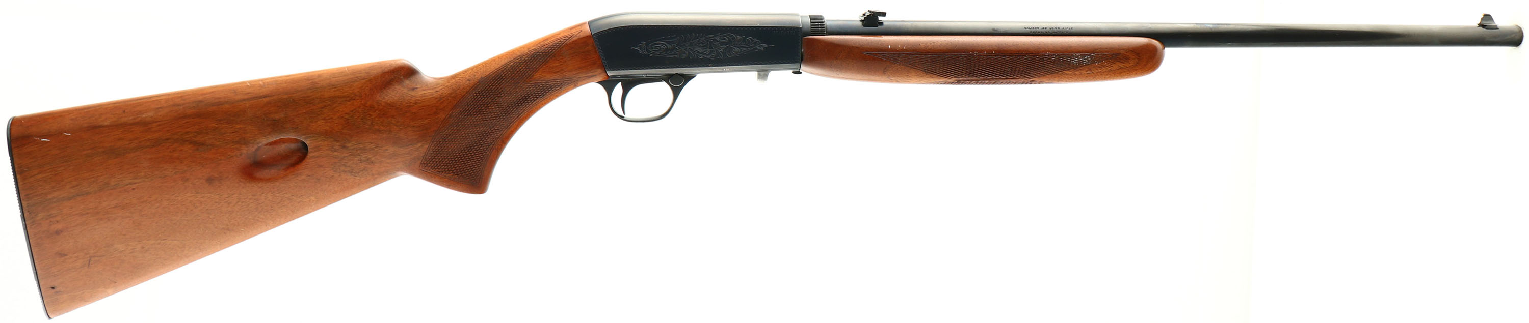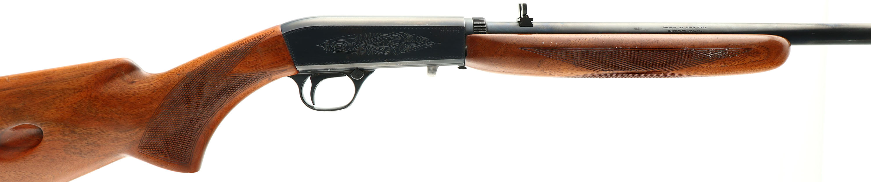 Browning Model SA-22, Grade 1, CAL: .22 LR, MFG: 1972 (Belgium), SN: 07178T72, Semi Auto Rifle, 19'' round barrel. The original checkered & flat pistol grip walnut stocks are excellent, with several minor scuffs,scratches or dings to the original finish. The original metal blue finish rates 95% overall, with some speckles or spotting on the receiver. Bore is excellent.The barrel carries a flip rear sight & blade front sight. The two factory holes atop the barrel are open. The receiver & trigger guard carry hand engraved floral/swirl pattern, with a border. Metal buttplate. FFL or C&R Req - Value: 500 to 800