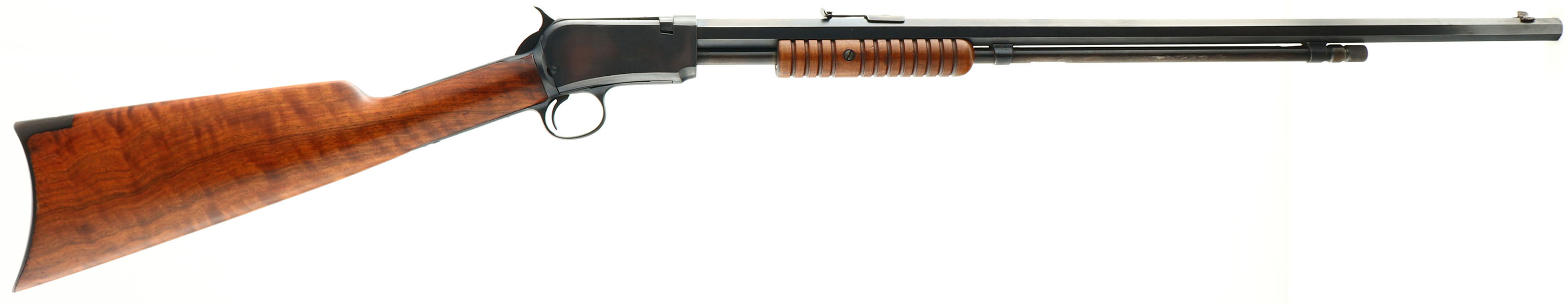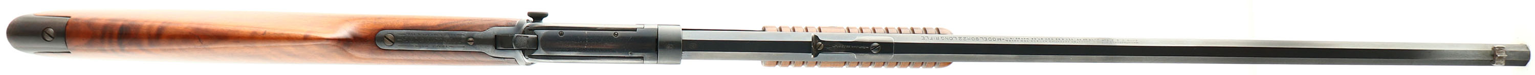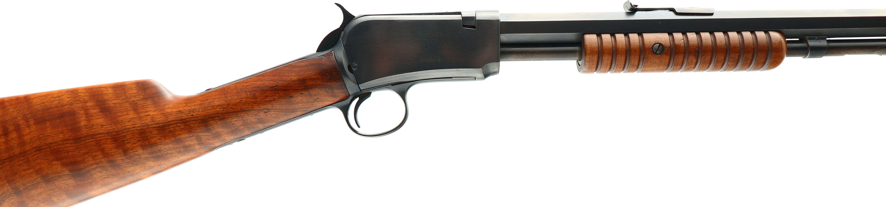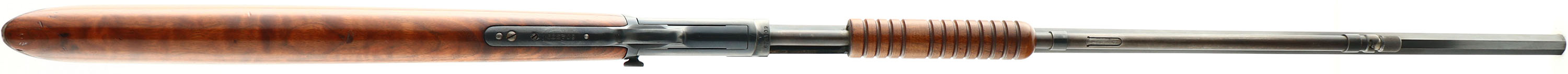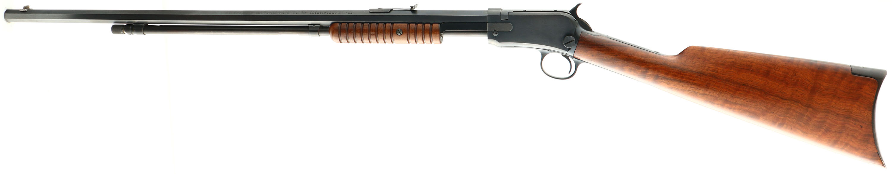 RARE Winchester, Model 90, .22 LONG RIFLE Cal., MFG: 1916 SN: 604329, Slide Action Pump, 24'' Tapered octagon barrel. The L.R, only caliber is the rarest & most desired caliber amongst collectors as only 10% of total production was this caliber. The L.R. caliber was added in the 1890 line-up in 1919. Therefore, there is some confusion about a receiver 1916 receiver & a 1919 introduction of the caliber. Whether the dating on the receiver is incorrect, or the receiver sat around the factory until it finally received a L.R. barrel in 1919, or it possible the barrel was later factory replaced. The truth is unknow to this cataloger. The original wood is excellent & solid. The original finish is excellent, with a few very tiny finish level handling marks. The stock displays fantastic wavy grain. The metal blued finish appears original & rates 98% on the barrel, 95% on the receiver, & 80% on the mag tube, with loss on the receiver due to tiny speckles. Bore is excellent. Barrel carries the original front & rear sights. Factory crescent steel buttplate, Excellent original example of a single caliber 90 remaining in very high collectible condition. FFL or C&R Req. - Value: 2000 to 4000