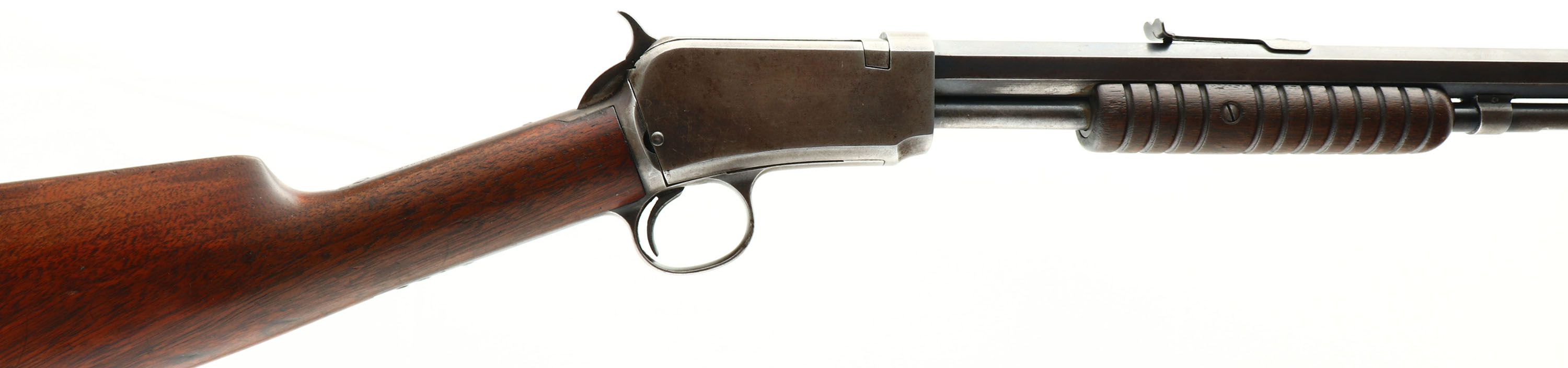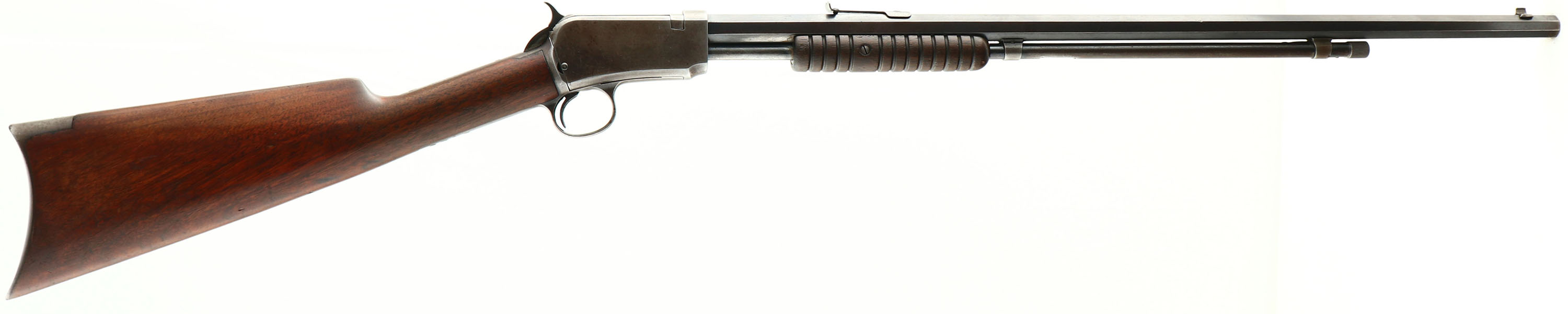 Winchester, Model 1890 3rd variation, .22 SHORT Cal., MFG. 1909, SN: 407093, Pump Action Rifle, 24'' Octagonal barrel. Single Caliber rifle. The original straight grip wood stocks are very good, with numerous minor scuffs, scratches & contusions to the original thinning finish. The original blue finish on barrel rates 60%, 20% on mag, while the blue on the receiver has worn mostly gun metal gray, with a thin brown patina & small remnants of original blue. The barrel carries an adjustable rear & a blade front sight. The bore is fair, with lots of roughness & pitting amongst visible rifling. Crescent metal buttplate. Tight smooth action. A desirable single short caliber 1890. FFL or C&R Req. - Value: 600 to 1200