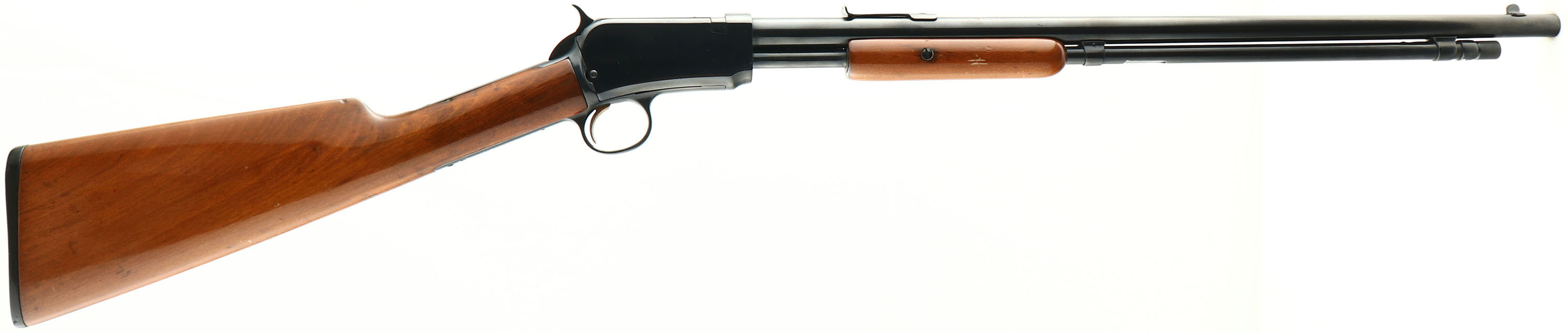 Winchester, Model 1906, .22 S. L. LR., MFG. 1910, SN: 225108, Take-down Pump Action Rifle, 20'' round barrel. This rifle has been fully refinished. The original wood stocks are very good, having been sanded & refinished. There is a 4'' tightly repaired hairline crack emanating from the upper tang & running back along the comb There are other minor blemishes & contusions to the high gloss finish. The reblued metal finish rates 95% overall, with some light speckling. Bore is fair, with cleaned roughness amongst worn rifling. Standard rear & front sights, with rear missing the elevation screw. Stock carries a Winchester plastic buttplate. FFL or C&R Req. - Value: 300 to 500