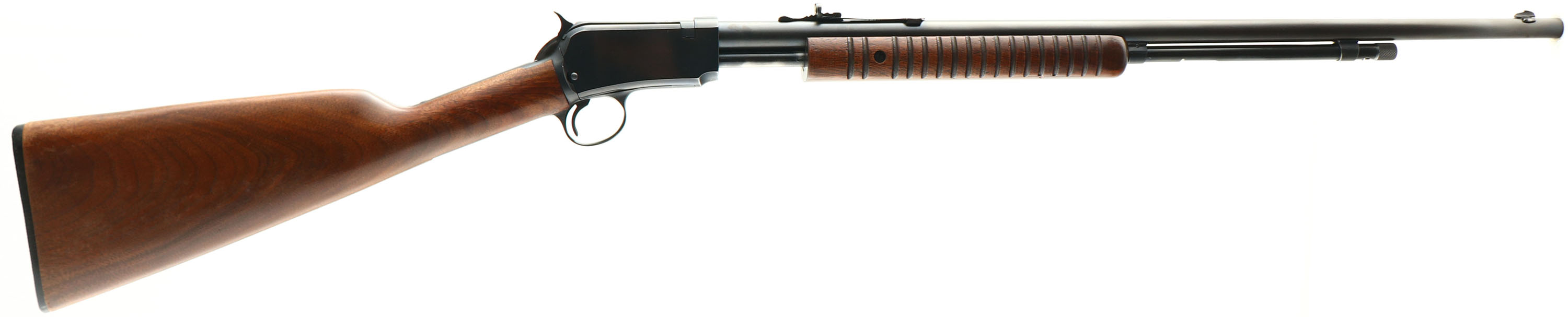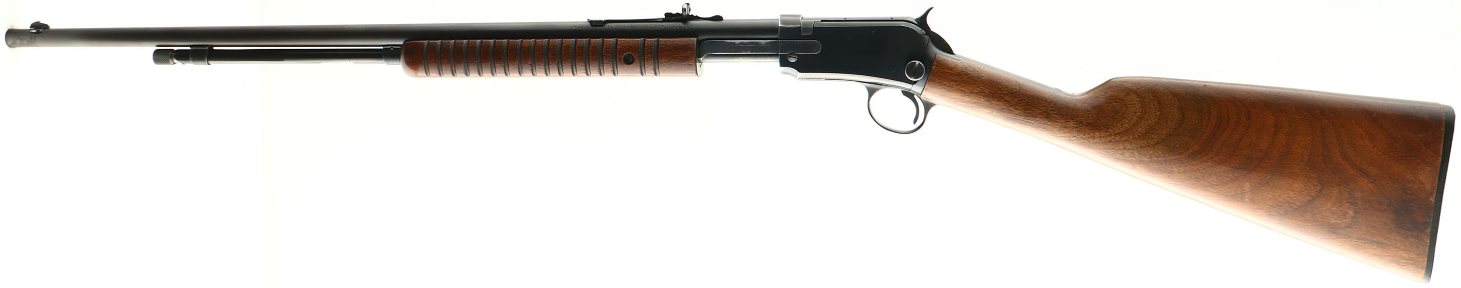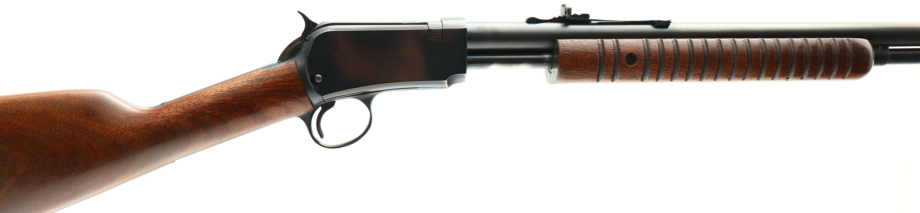 Winchester, Model 62A, .22 S. L. & L.R. Cal., MFG. 1953 SN: 345754, Pump Action Rifle, 23'' round tapered barrel. The original wood stocks are excellent, with some finish level light scratches & scuffs to the lightly thinning of the original finish. The original metal blue finish 85% overall. Bore is excellent. Barrel fitted with an adjustable rear sight & a Marbles Sheard front sight. Very nice overall appearance on this late production 62. FFL or C&R Req. - Value: 750 to 1500
