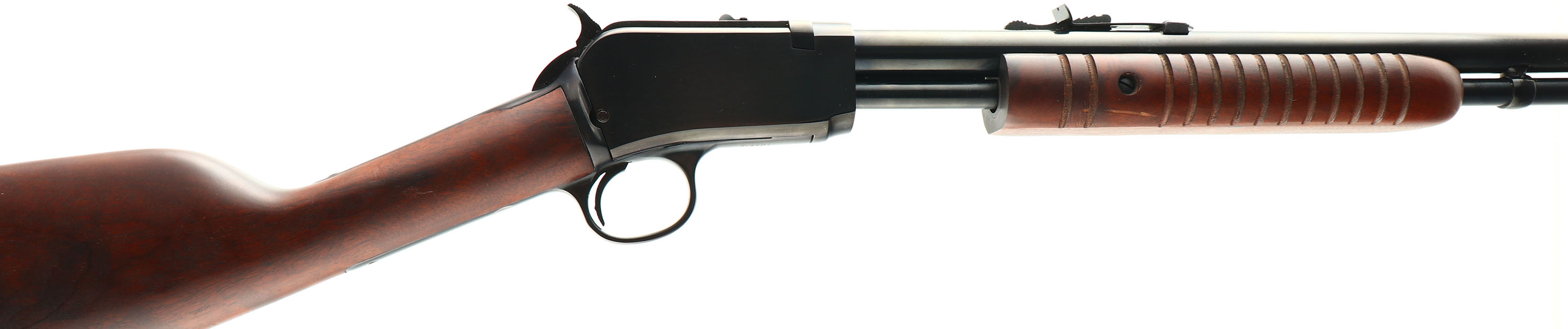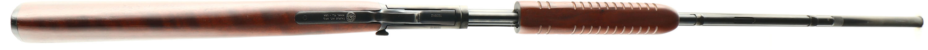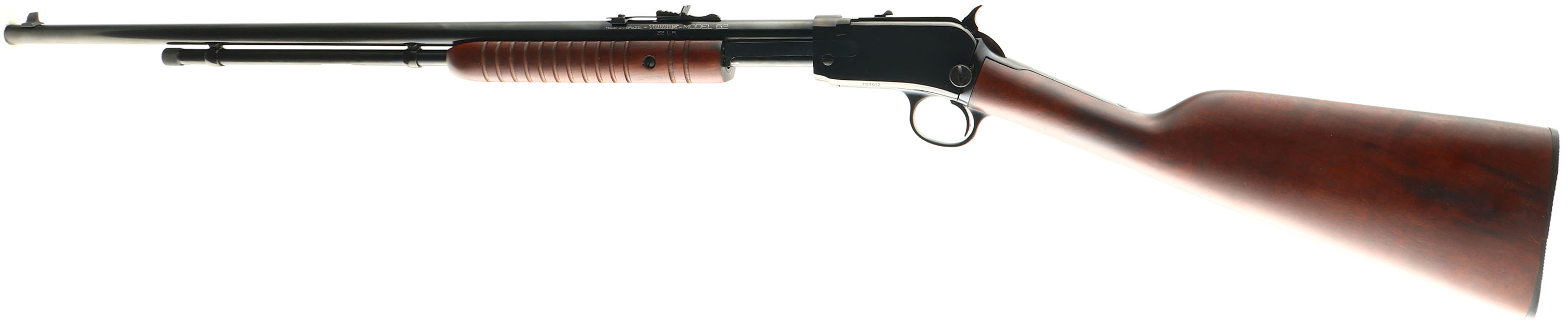 Taurus Model 62, marked .22 L.R., MFG. Modern, SN:TD3912, Pump Action Rifle, 23'' round barrel. Taurus' modern version of the famous Winchester model 62 rifle. The original straight grip wood stocks are excellent, with a couple of very minor contusions or surface blemishes to the original factory finish. The original metal blue finish is 99% overall. Bore is excellent. Barrel fitted with factory sights. Original checkered plastic buttplate. The forearm is the larger corncob style. An excellent original example. FFL Req. - Value: 200 to 300