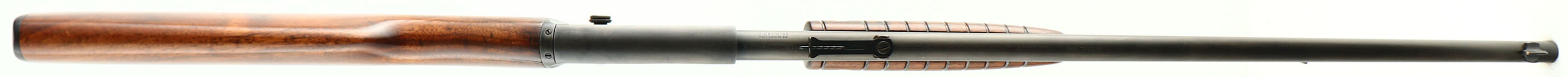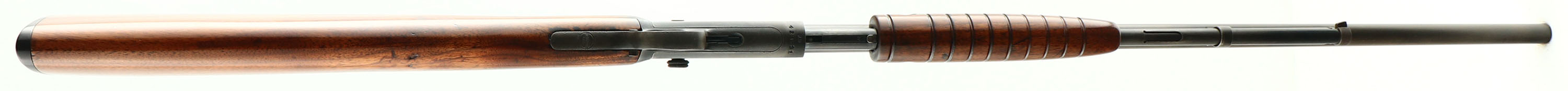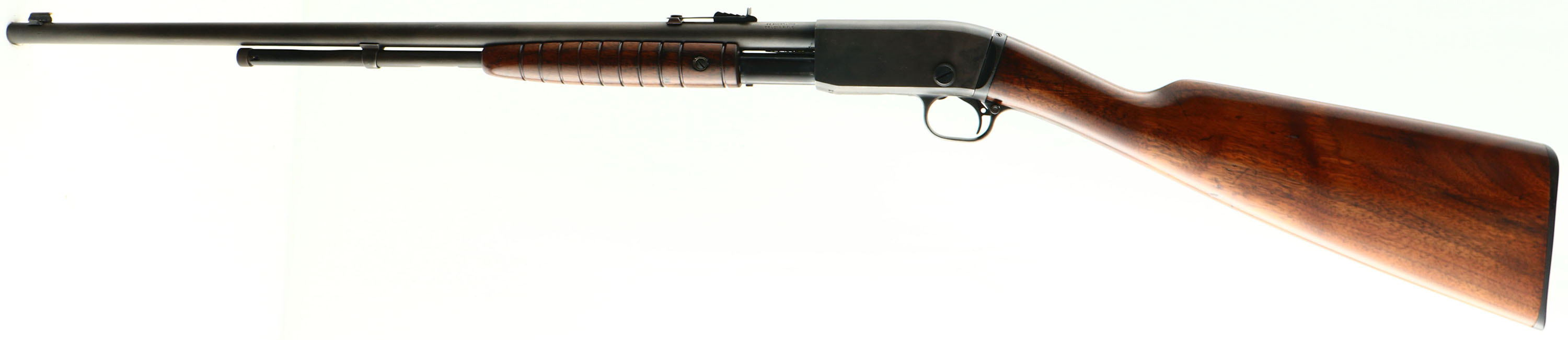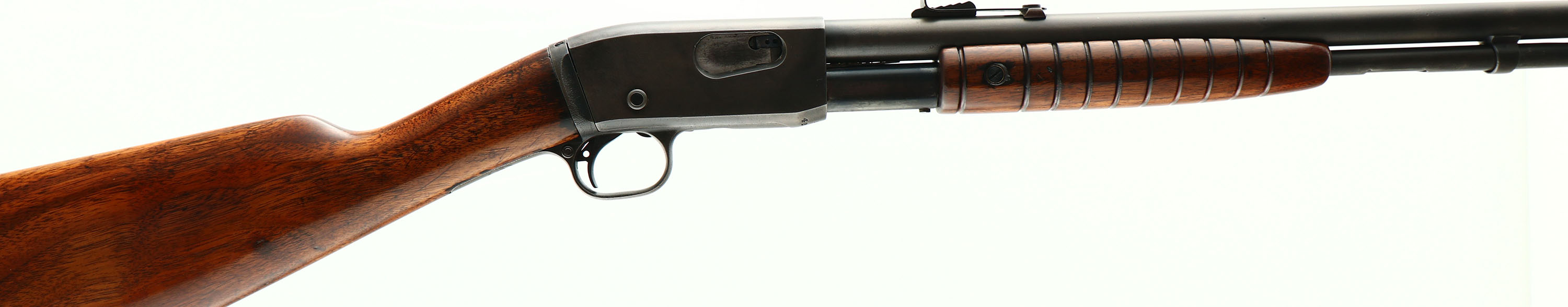 Remington, Model 12A, .22 S. L. & LR., MFG. 1909-36, SN: 428591, Pump Rifle, Take-down, 22'' Round barrel. The original straight grip wood stocks are very good, having been lightly sanded & refinished. There are the remains of numerous minor handling marks, scratches & contusions under the high gloss finish. The metal has received a cold blue refinish which has a gray/black appearance, with some pitting found under the new finish. Fitted with updated adjustable rear & long blade front sights. Bore is fair, with cleaned roughness & pitting amongst worn rifling. Stock nicely fitted with an excellent reproduction of the Remington UMC plastic buttplate. FFL or C&R Req. - Value: 200 to 350