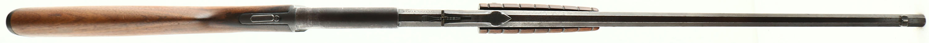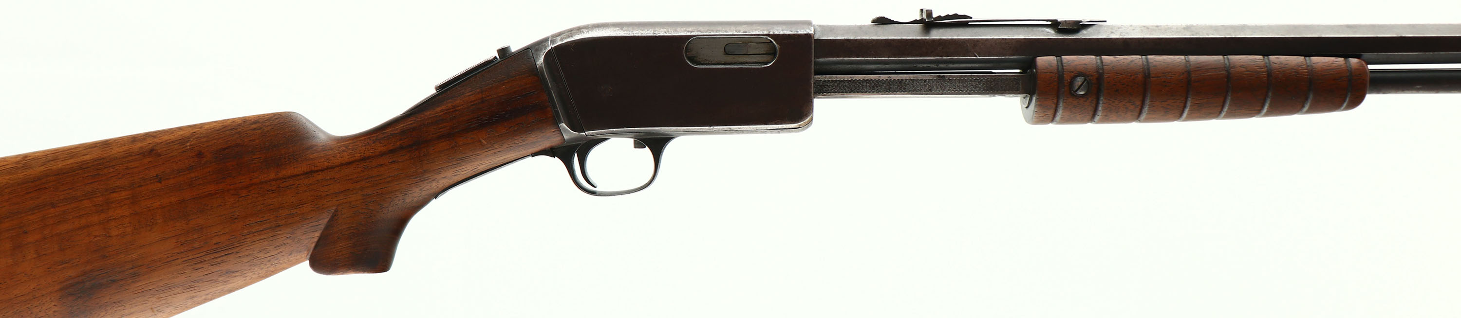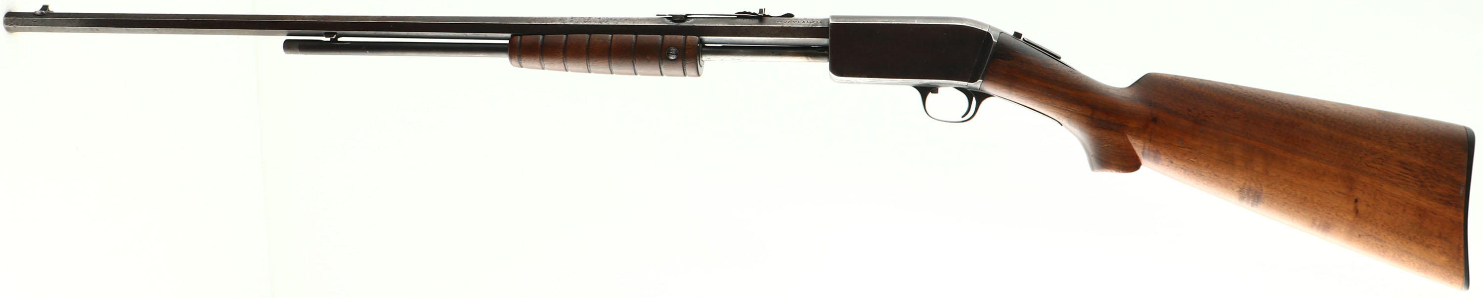 Marlin, Model 38, .22 S. L. & LR. Cal., MFG. 1921-30, SN: A8171, Pump Rifle, 24'' Tapered octagon barrel, 2/3rd mag. The original factory wood stocks are very good & solid, having been sanded & refinished some time ago. The wood has since accumulated several minor scratches & contusions, with a couple of groupings of larger dings on the left side belly of the stock. Stocks retain a nice authentic appearance. The factory metal blue finish has worn or toned to a gray/brown patina. Barrel carries an adjustable rear & small blade front sights. Bore is very good, Original Marlin buttplate. Smooth tight action. FFL or C&R Req. - Value: 250 to 500