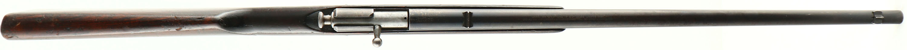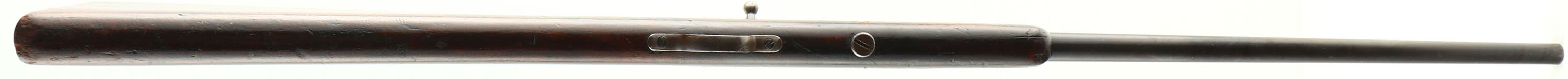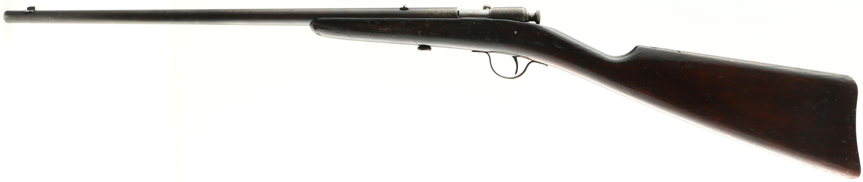 Winchester, Model 1900, CAL: .22 SHORT& LONG, MFG: 1900, SN: NONE, Bolt Action Rifle, 18'' Round tapered barrel. This is the early variation without the model # stamped on barrel. The original wood stock is good, with numerous small contusions, gouges & scrapes. The original finish has darkened with age & use, & it carries an additional layer of finish. There are a couple of hariline cracks coming off the buttend. The original metal blue finish has worn thin, with about 40% remaininig. The bore is good, with spots of cleaned pitting & corrosion amongst thinning rifling. Barrel carries a small fixed rear & small blade front sights. Buttstock carries no buttplate, which is correct for this model. Collectible early production variation. FFL or C&R Req. - Value: 200 to 400