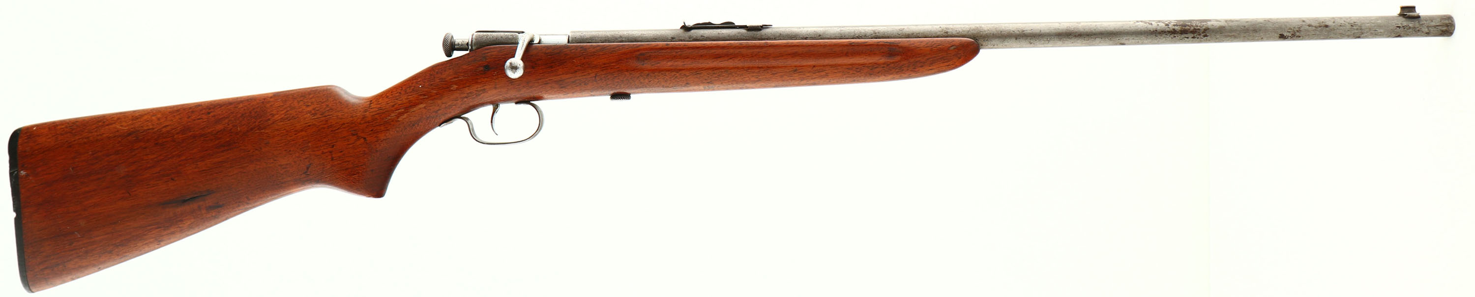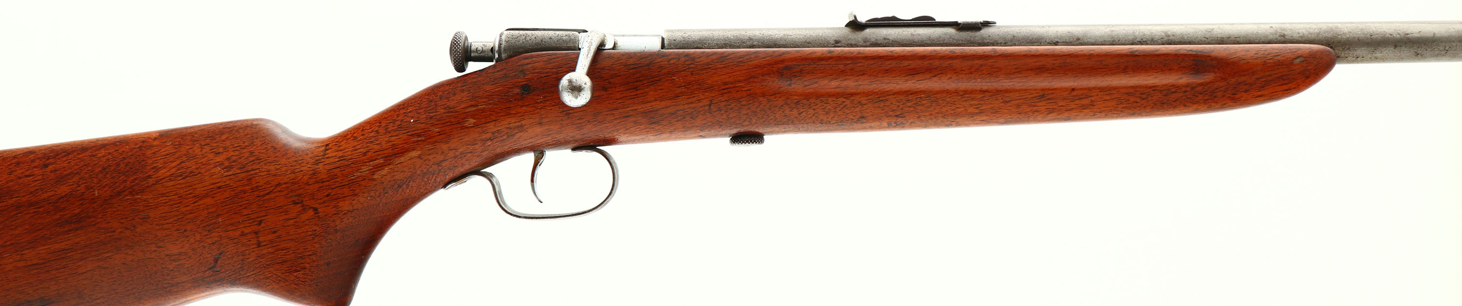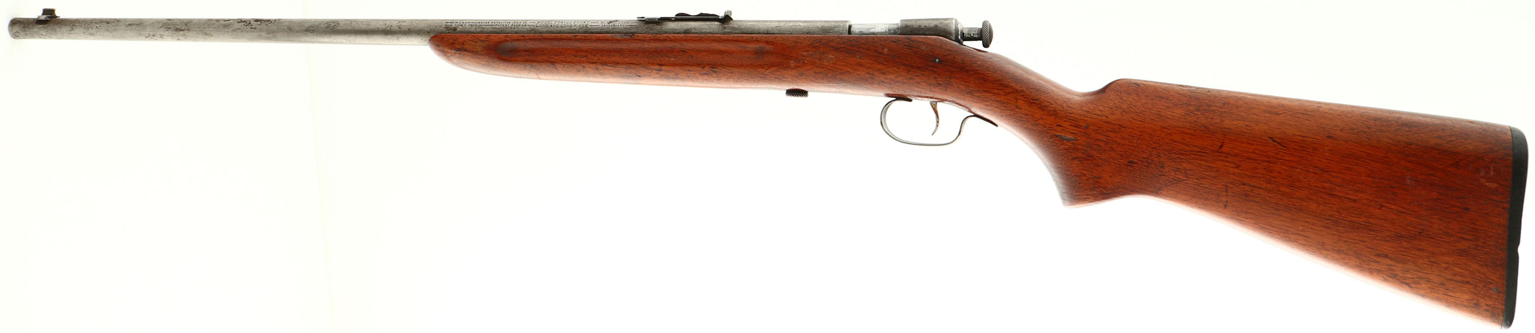 Winchester, Model 60A Sporting, CAL: 22 S,L,LR, MFG: 1932-39, SN: NONE, Bolt Action Rifle, 23'' barrel. Rarer early production rifles carried the shorter 23'' barrels & finger grooved stocks & are desired amongst collectors. The finger groove, flat pistol grip wood stock is good & solid. The stock has numerous minor contusions, surface scrapes & scratches, with an added layer of finish over the original finish. The metal finish has fully worn a gun metal gray. Bore is excellent & bright. Factory sights. Buttstock carries a Winchester marked, checkered black plastic buttplate. FFL or C&R Req. - Value: 100 to 400