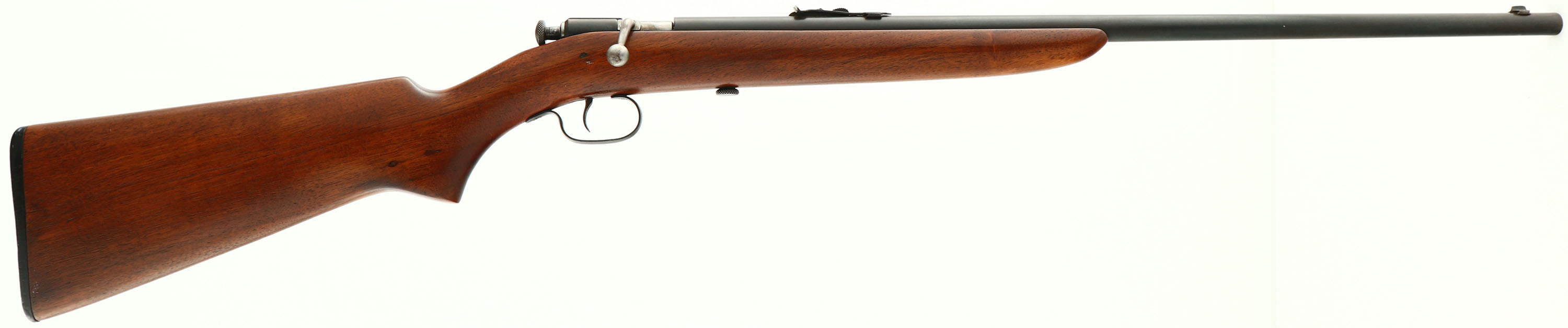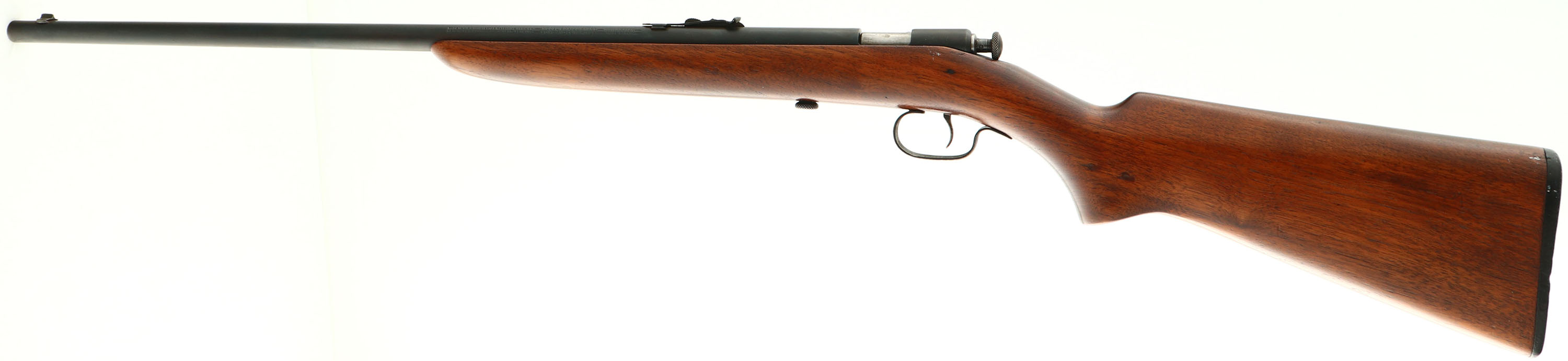 Winchester, Model 60A Sporting, CAL: 22 S,L,LR, MFG: 1932-39, SN: NONE, Bolt Action Rifle, 23'' barrel. This is a later production rifle, with the non-finger grooved stock. The flat pistol grip wood stock is good & soild, after having a crack repair that utilized 6 pegs, two at each side of the pistol grip & two on the flat of the pistol grip. Crack is no long visible after the stock was lightly sanded & refinished. There a few minor contusions, surface scrapes & scratches to the finish. The metal was cold blued previously & is now showing areas of wear & a brown patina. Bore is excellent & bright. Factory sights. Buttstock carries a Winchester marked, checkered black plastic buttplate, with some edge chipping. FFL or C&R Req. - Value: 200 to 400