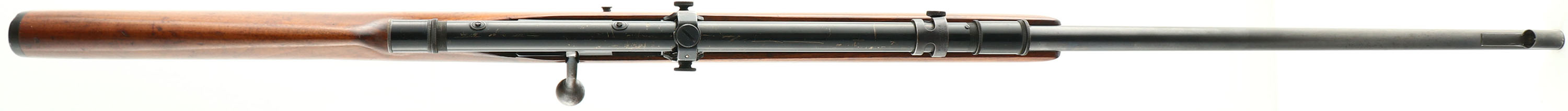 RARE Winchester, Model 69 Factory Scoped, .22 S.L.LR. Cal., MFG. 1935-63, SN: None, Bolt Action Rifle, 25'' Tapered barrel. During WWII, Winchester sold the British Government Model 697 rifles with scopes & no provisions for open sights, & Model 69 stamped rifles fitted with the same scopes, but also with open sights. After the war, Winchester sold some of these rare configured Mod 69 rifles, with the factory mounted scopes & open sights to the general public. The original pistol grip wood stock is excellent & solid, carrying the majority of the original finish. The stock has a number of minor dings & scratches, with a few nicks to the edge of the pistol grip. The metal blue finish on the barrel & receiver rates 80% overall. The trigger guard & mag floorplate have a brown patina. Bore is excellent. Rifle is fitted with an unmarked black scope, but matching scopes marked with Winchester stampings, mounted on Winchester scope rings & blocks. The proof stamping normally stamped on the top of the receiver & barrel, are both shifted to the left side to accommodate the factory mounted scope & bases. The receiver has a wheel adjusting sight, while the barrel has no rear sight & a hooded silver beaded blade front sight. Winchester buttplate, with a missing chunk to the left of the toe. ''Winchester'' & ''69'' stamped magazine. A rare rifle, with collectible optics. FFL or C&R Req. - Value: 600 to 1200