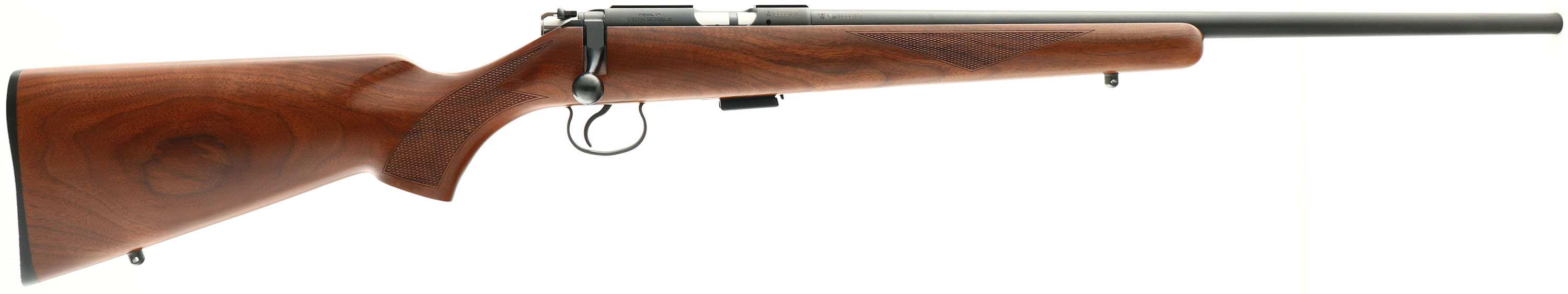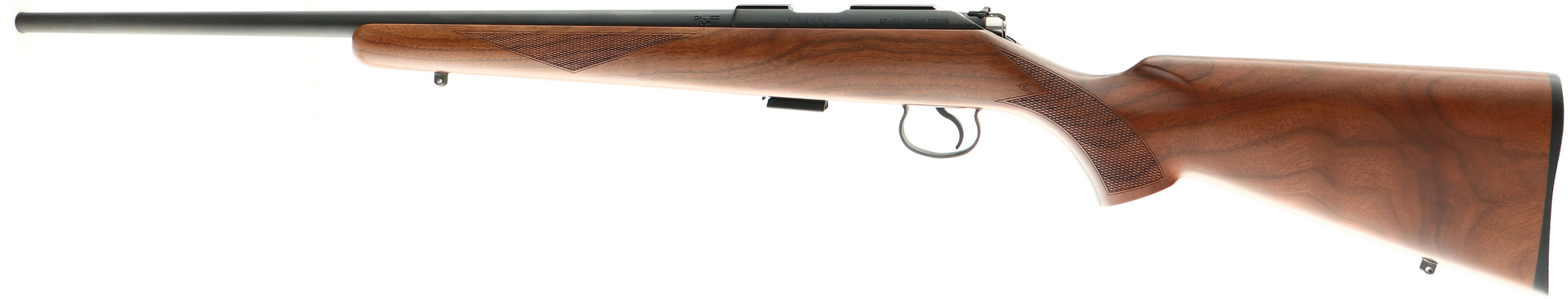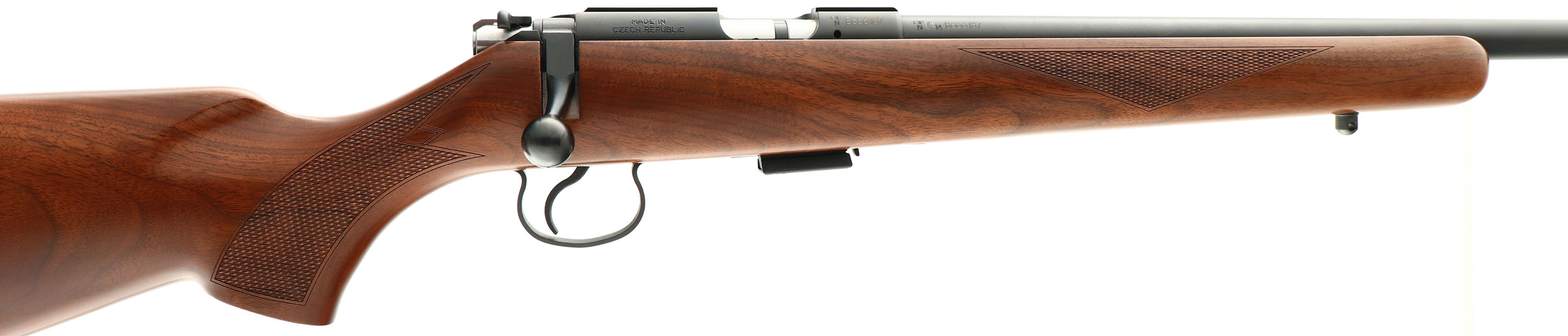 CZ USA. Model: 455 American. Cal: .22 LR, MFG: 2010-18, S/N: B666137, Bolt action, 20 1/2'' barrel, Made in the Czech Republic, Imported by CZ-USA. Discontinued in 2018. The original checkered & flat pistol grip wood stock is excellent. With sharp checkering & fantastic grain. There are virtually no handling marks to the original finish. The metal blue finishes rate 99%. Bore is excellent. The receiver has an integral grooved scope base, while the barrel has no iron sight provisions. Stock mounted with the original buttplate. Sling studs. Detachable mag. Excellent overall condition. FFL Req. - Value: 300 to 500