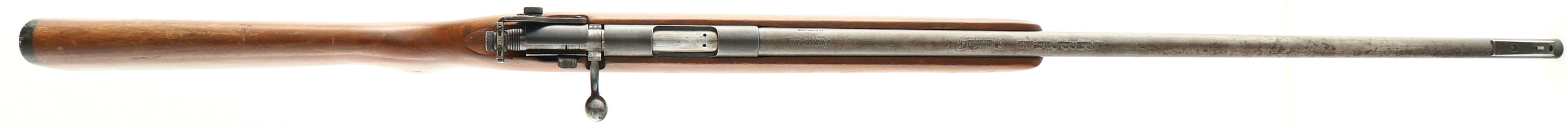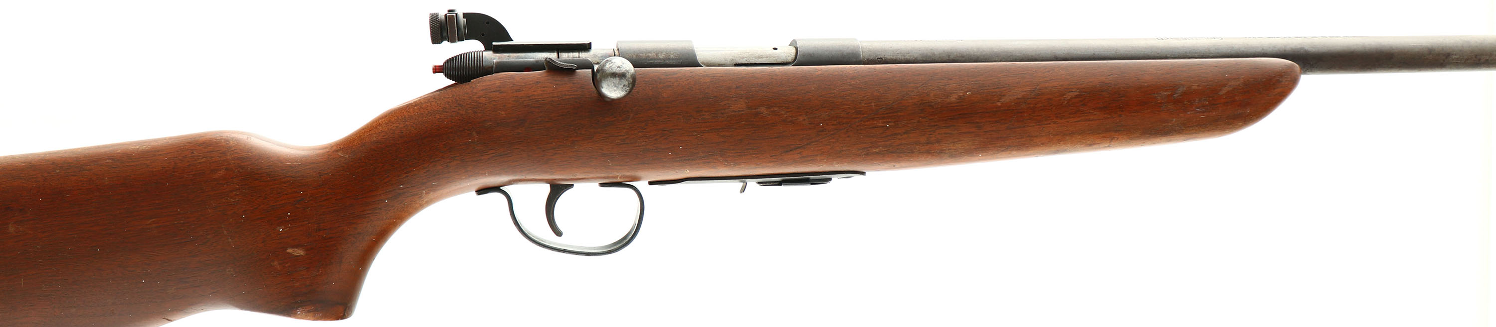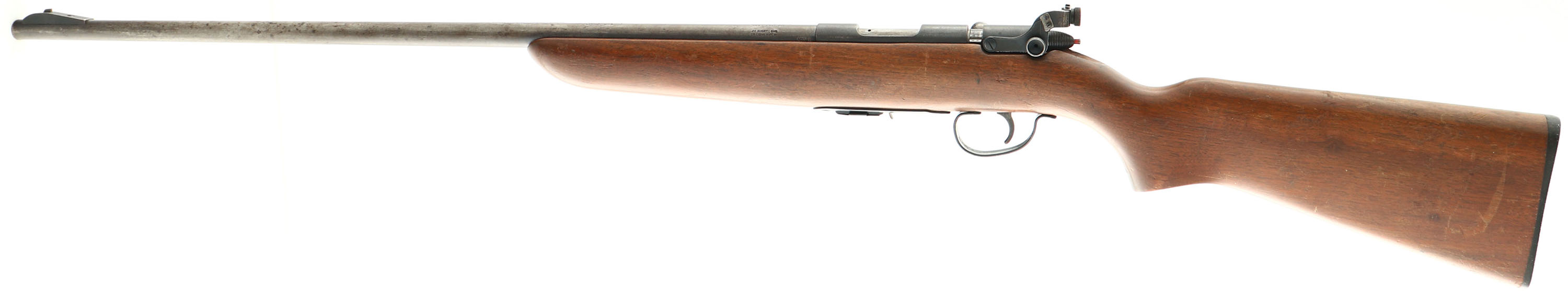 Remington, Model 511P Scoremaster, 22 S. L. LR, MFG: 1939-62, SN: NONE, Bolt Action Mag Fed Rifle, 25'' round tapered barrel. The 511P has the same specs as the standard 511, but with a patridge-tyoe front blade sight & a point-crometer peep receiver sight. The original flat pistol grip stock is excellent, with several minor surface scrapes, scratches or contusions to the original finish. The original metal blue finish has worn or toned mostly to a a gun metal gray, with spotty areas of thin brown patina & some remnants of original blue in more protected areas. Bore is excellent. Fitted with the aforemention upgraded sights. The stock carries the original buttplate. ''Remington'' marked detachable mag. FFL or C&R Req. - Value: 250 to 450