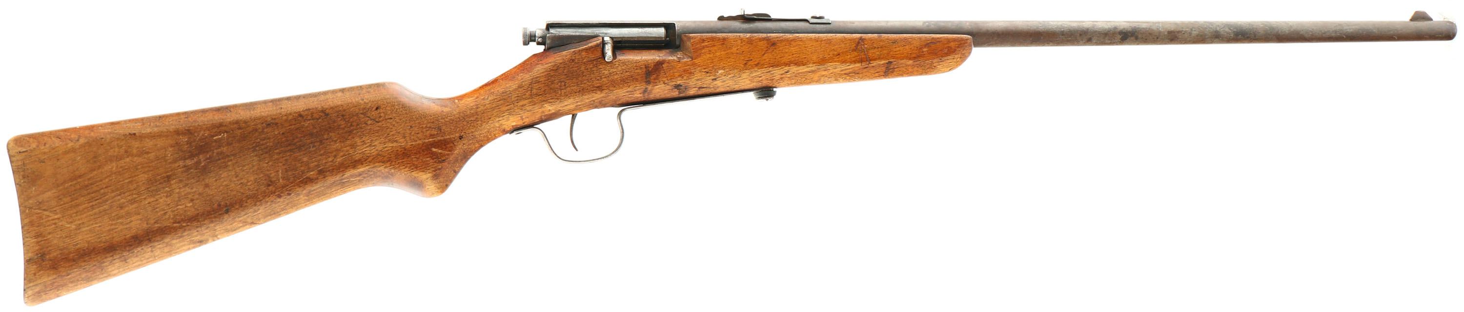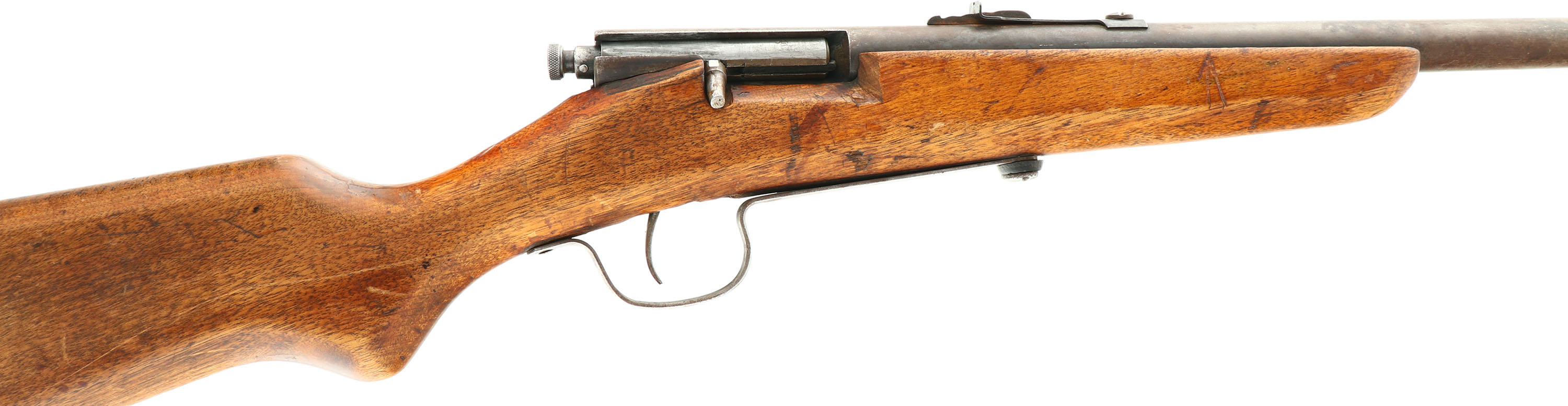 Springfield (J. Stevens Arms Co.), Model 15, .22 S, L, LR Cal., MFG. 1930-47, SN: None, Bolt Action Single Shot Rifle, 22'' round barrel. The replaced rounded pistol grip wood stock good & solid, but has been cudely modified to fit the bolt & trigger. There are several minor to small scrapes, contusions & scratches to the thinning & flaking finish. The metal blue finish has worn gun metal gray, with a thin brown patina. Bore is very good. The barrel caries an adjustable rear & front blade sight. The bolt handle has been cutoff mid shank, but still functions. Stock was produced without a buttplate. A very basic, but functioning .22 rifle. FFL or C&R Req. - Value: 50 to 100