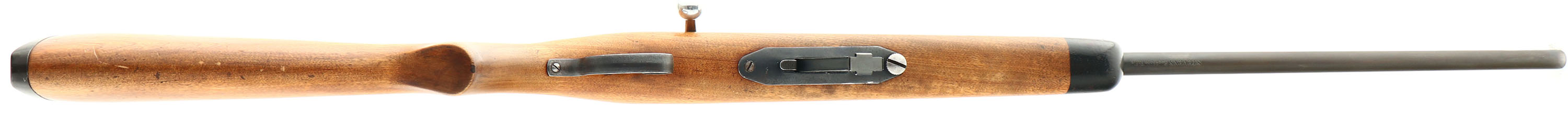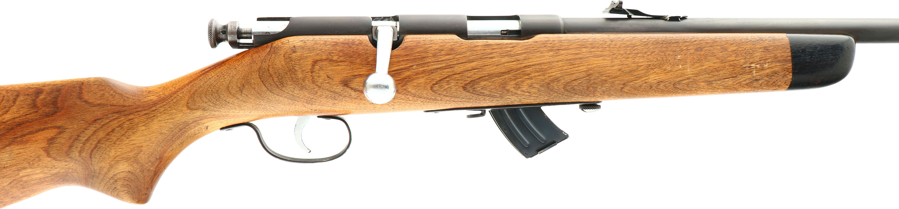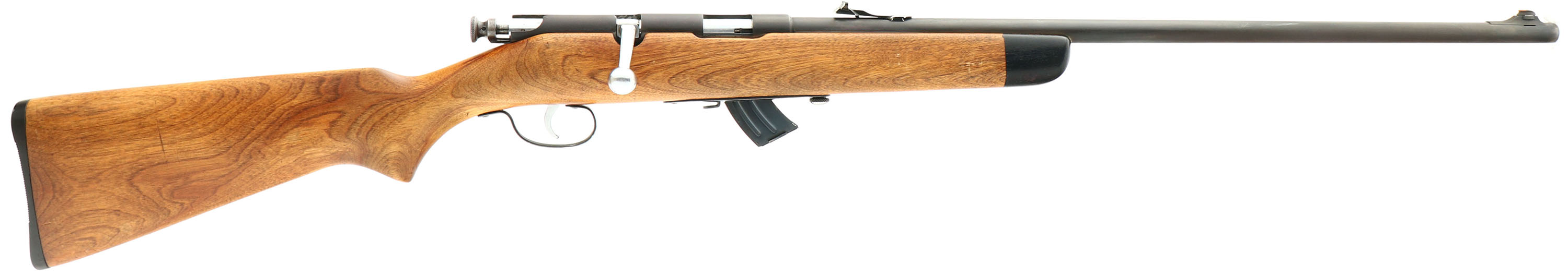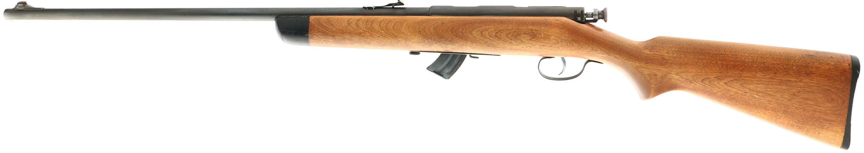 J. Stevens Arms Co., Model 56 Buckhorn Rifle, .22 S, L, LR Cal., MFG. 1935-48, SN: None, Bolt Action Rifle, 24'' round barrel. The original flat pistol grip wood stock is excellent, with some minor scrapes, contusions & scratches to the thinning original finish. The original metal blue finish is toning gray/brown, with 80% coverage. Bore is excellent. The barrel caries an updated adjustable rear & front blade sight. Stock carries the original buttplate. Nickeled bolt, bolt handle & trigger. FFL or C&R Req. - Value: 100 to 200