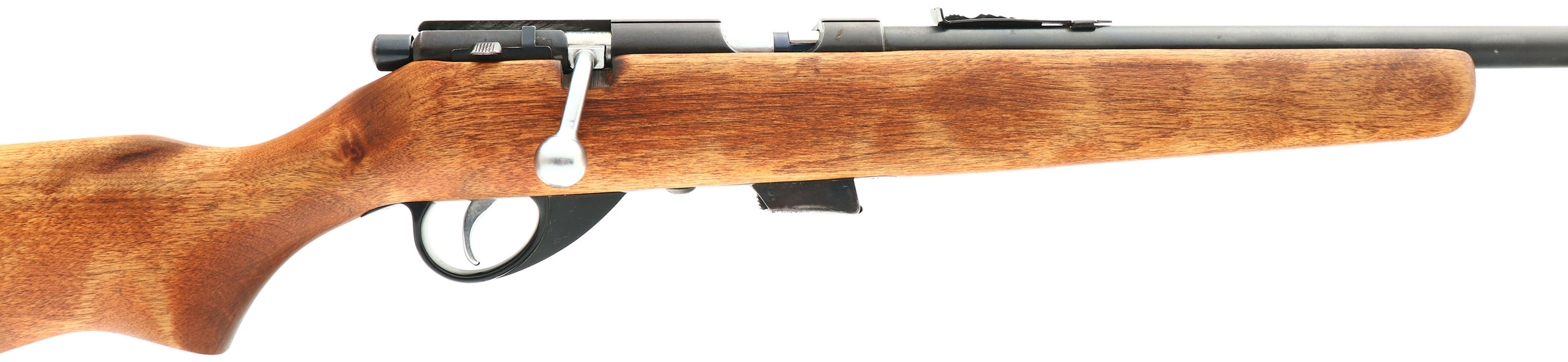 J.C. Higgins (Sears), Model 103-228 (Marlin 80), Marked .22 S, L, LR Cal., MFG. 1955-59, SN: None, Bolt Action Rifle, 24'' round barrel. Production of 26,000+ rifles. The original flat pistol grip wood stock is excellent, having been lightly sanded & oiled. There remains a few very minor scrapes & contusions. The original metal blue finish rates 85% on the barrel, 70% on the receiver toning a bit plum. The bore is excellent & bright. The barrel carries an adjustable rear & front blade sights. Grooved receiver. The stock carries the original plastic buttplate. Detachable mag. Nickeled bolt, bolt handle & trigger. FFL or C&R Req. - Value: 100 to 300