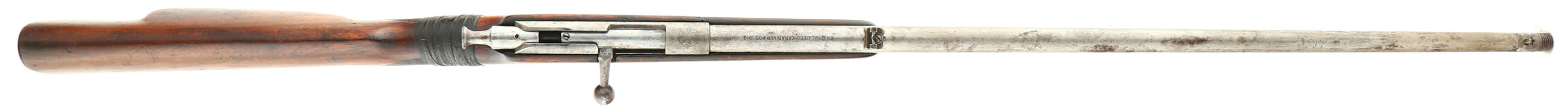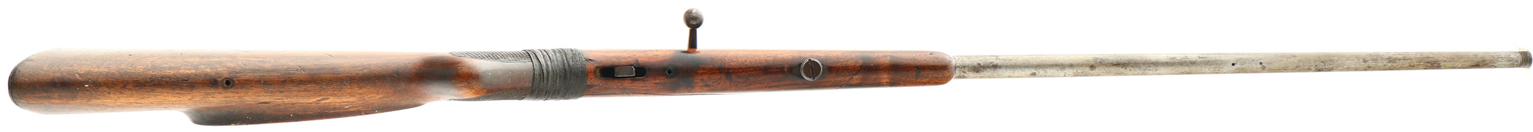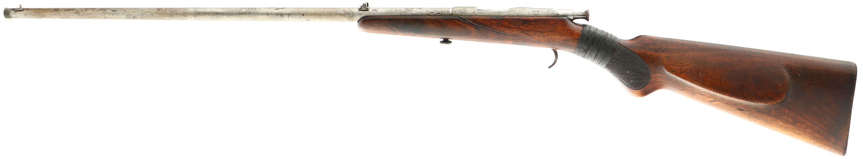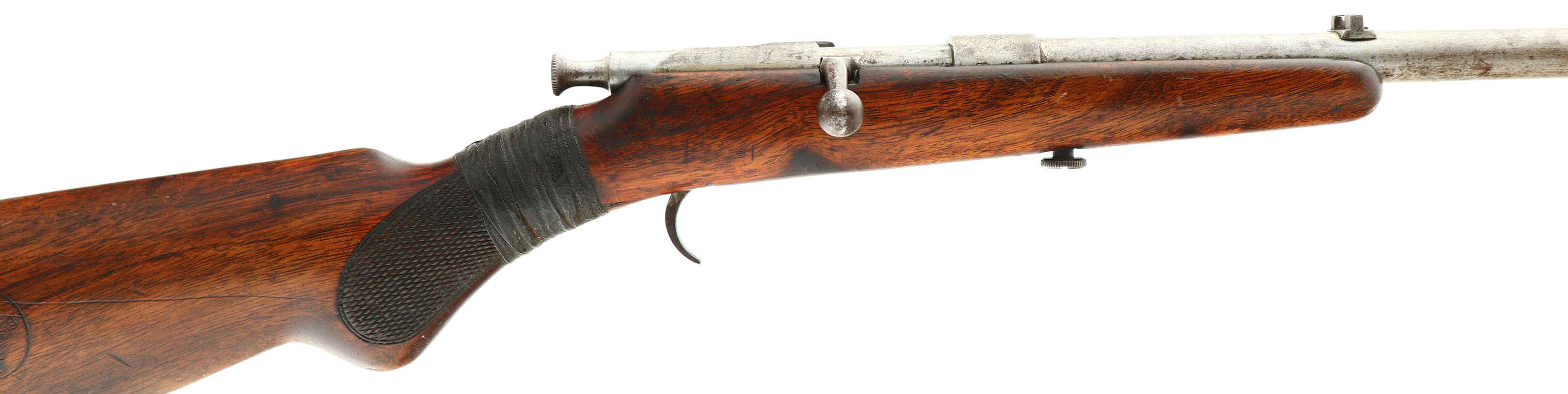 Gustav Genschow & Co., Original Geco Carabiner, Model 1919, .22 L.R Cal. (54 MM), MFG: 1920's, SN: 805, Bolt Action Rifle, 23'' round barrel, with treaded muzzle. These German made rifles were often refered to in Europe as ''Garden Guns''. The checkered, cheeked & round pistol grip wood stock is fair & solid, despite a break in the stock which has necessitated tape at the wrist & a large glued crack repair on the left side of receiver running into the checkering on left side of wrist. The stock has small contusions, scrapes & scratches to the original finish. There is a large trademark oak leaf/tree cartouche on the right side of stock, with the word ''GECO'' & ''1919''. The top of the receiver has the same leaf/tree & ''GECO'' trademark. The metal blue finish has fully worn gun metal gray. The barrel is fitted with a fixed rear sight & a gunsmith made post in dovetail front sight. Bore is fair, with roughness, pitting & scarring amongst worn rifling. Smooth metal buttplate. Missing the triggerguard. Appears to fuction fine, but could use some work to restore properly. FFL or C&R Req. - Value: 50 to 100