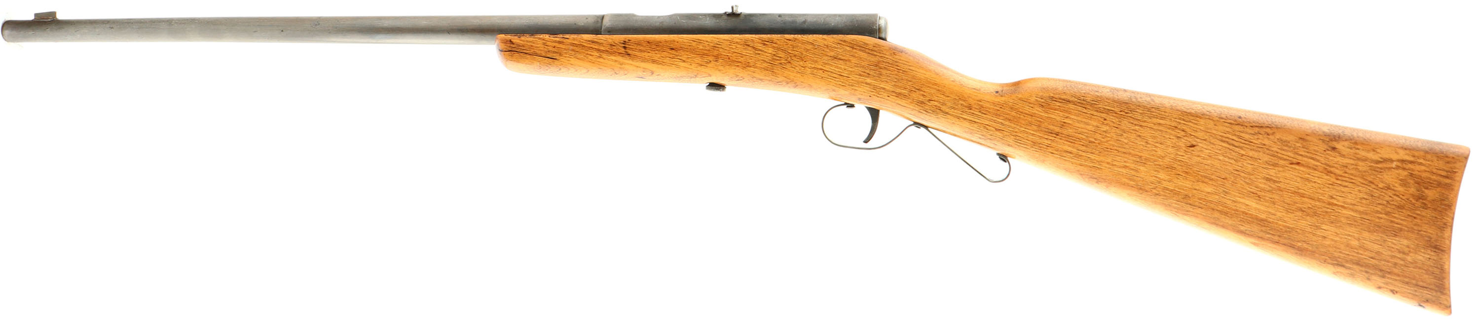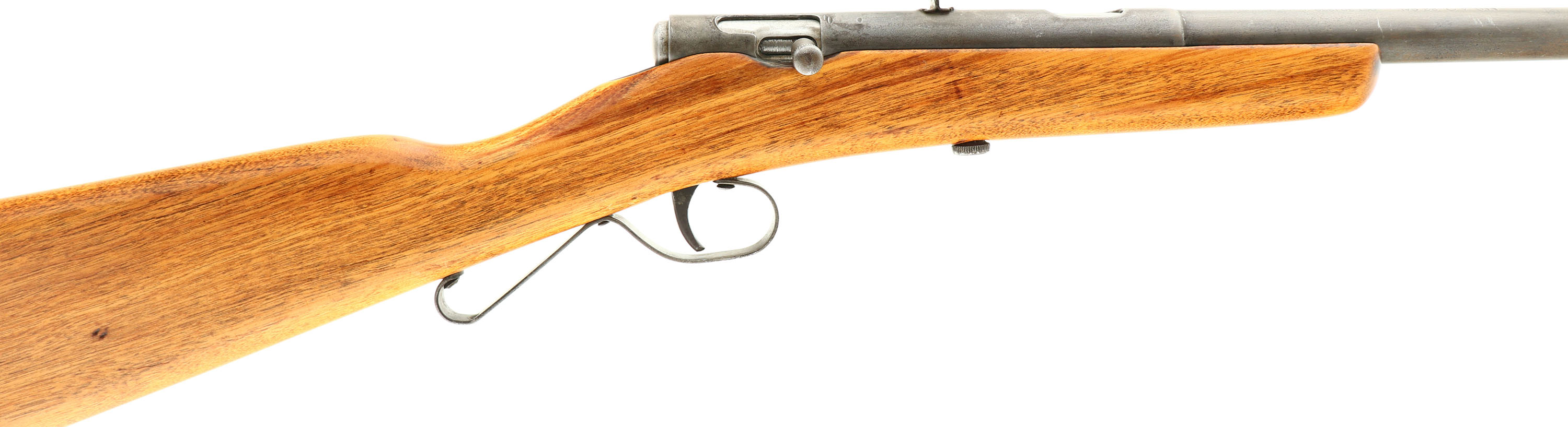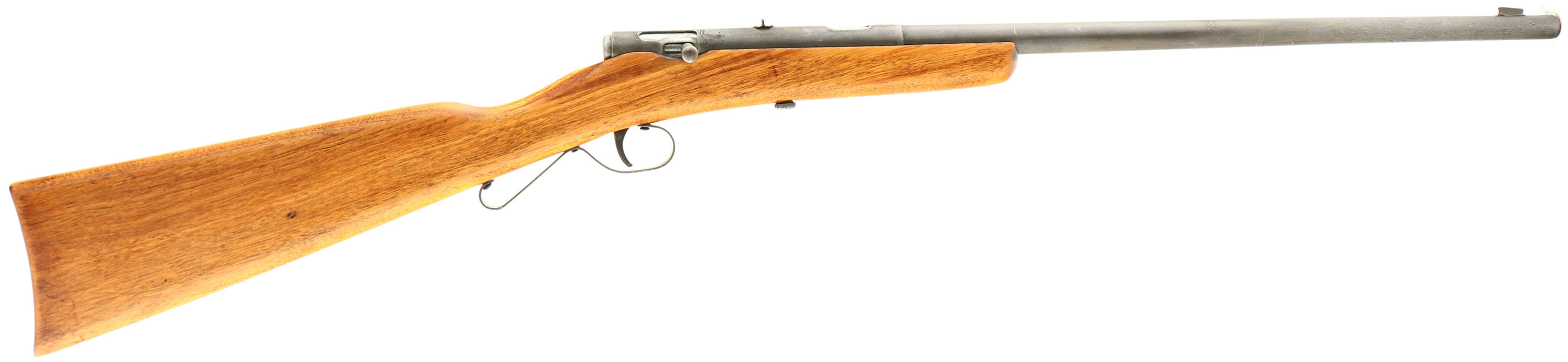 C.J Hamilton & Sons Model No. 43, 22 CAL L & S, MFG: 1924-32, SN: NONE, Bolt Action Rifle, 16'' round tapered barrel. 35'' overall length. Similar to the model 23, with a top loading port. The straight grip board type walnut stock is very good, as sanded & refinished. It displays a few minor contusions & blemishes under the finish. Original metal blue finish has fully worn a gun metal gray. The steel rolled barrel carries the original brass liner, which has a good bore. 12 groove bore with 1 turn in 16''. Factory blade front & fixed rear sight. Carries no buttplate as manufactured. ''S'' shaped trigger guard. FFL or C&R Req. - Value: 125 to 250
