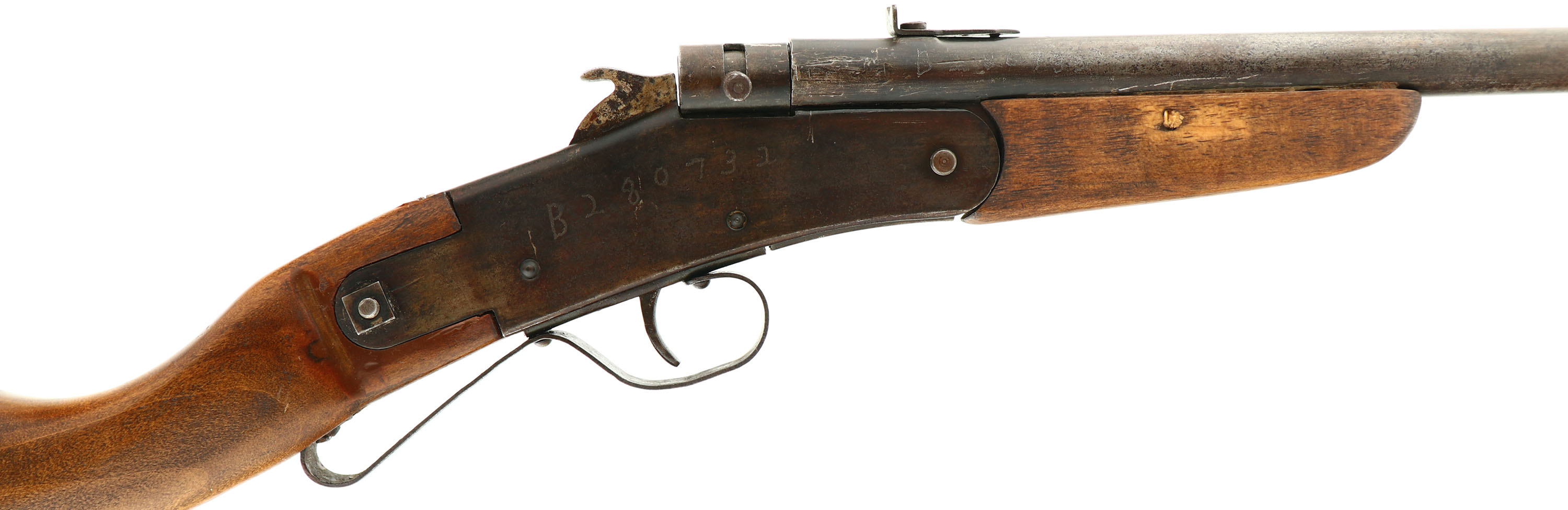 C.J. Hamilton & Son, Model The Hamilton Rifle No. 27 (USA produced version), .22 LR, MFG 1907-30, Single Shot, Tip-up Break Action Rifle, SN: none, 14 7/8'' round barrel. 29 1/2'' overall length. Circa 1906 through 1940's Cloverine Salve ran ads in comic books & newspapers asking kids to sell their salve & offering awards for the amount of product sold. The prizes include such pieces as this Hamilton rifle, a Red Ryder BB gun, toys & more. One of the first rifles offered in the Cloverine ads was the Hamilton Model 27 rifle. Other companies duplicated these award driven sales opportunities for kids selling magazines, seeds & other household items. The replaced flat board, straight grip, walnut stained birch stocks are very good & solid. The stock has a long area of fill behind the trigger guard. The stocks have a few minor of scratches & contusions to the very good finish. The metal has worn to a mix of gun metal gray & thin brown patina, with some remains of original blue mixed in. Some light pitting & speckling. The sides of the receiver & on the barrel have been electric pencil engraved with a 7 digit number. Receive screw & nut holding on the stock is a replacement. Steel rolled barrel over brass bore liner, 6 groove bore with 1 turn in 15''. Bore is good. Blade front & early rear sight combination. ''S'' shaped trigger guard, with replacement screw. No buttplate style. FFL or C&R Req. - Value: 50 to 150
