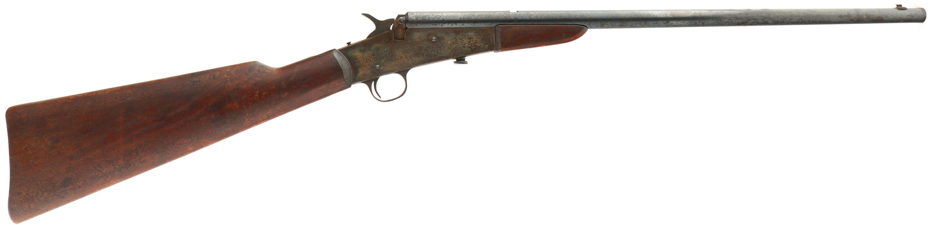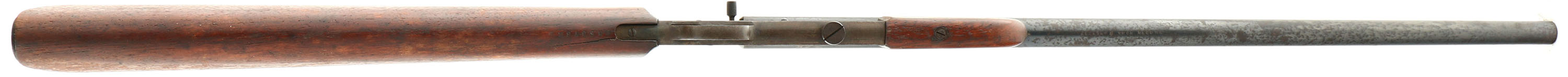 Remington U.M.C., Model 6 SMOOTHBORE, CAL: .32 Short or Long RF, MFG: 1912-33, SN: S-353732, Single Shot Falling Block Rifle, 20'' barrel. Although this model started production in 1901, this rifle was produced after 1912 when Remington & UMC consolidated, as stamped on the side of the receiver. The straight grip wood stocks are good & solid, despite a 2'' crack the both the top & bottom of wrist. There are light scratches, scrapes & contusions to the original finish, along with one larger missing chunk of wood from the left side fo the forend. Matching SN on stock & barrel. The metal blue finish on the barrel 80%, but fully covered with lots of spotty areas of pitting. The case-hardened receiver still displays mutted case-colors. Bore is poor, with large areas of deep pitting & scarring. Small blade front sight, but open dovetail missing fixed rear sight. Remington-UMC smooth metal buttplate. FFL or C&R Req. - Value: 50 to 150