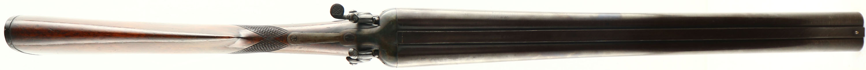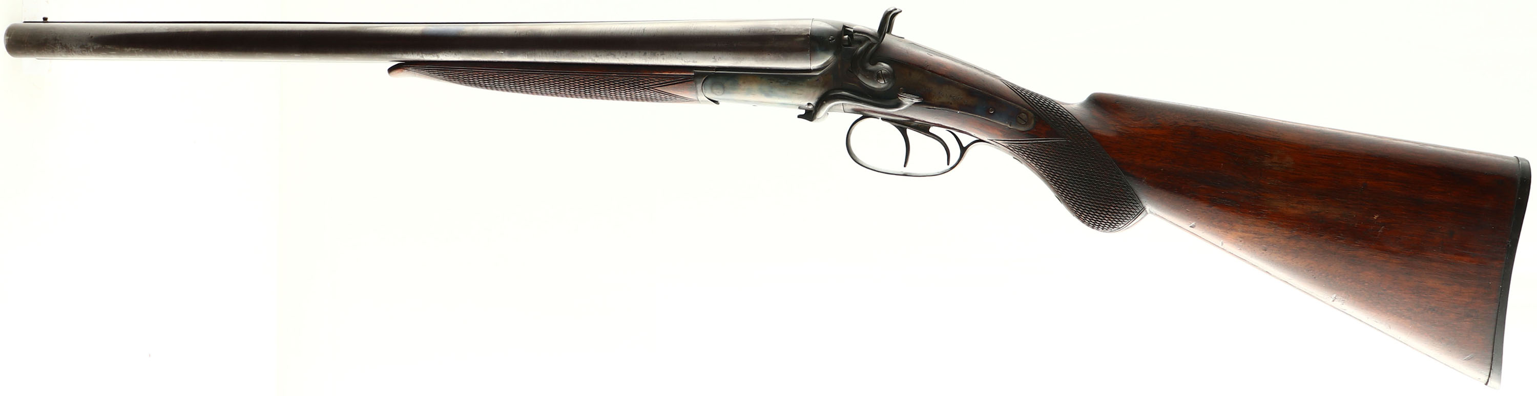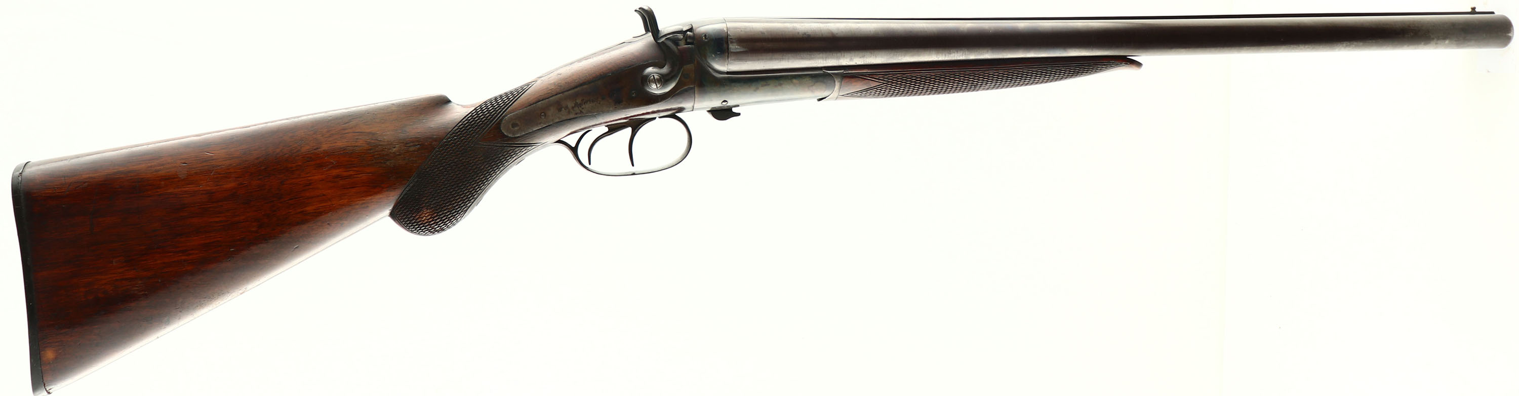 William Moore & Co., Bank/Coach Gun, CAL: 10GA, MFG: 1854-74, SN: NONE, Sidelever Break Action SxS Shotgun, 20'' Laminated Steel barrels. The side plates are marked ''Wm MOORE & CO''. The barrel rib is marked ''LAMINATED STEEL''. The original checkered round knob stock & forend are excellent. There are contusions, scratches, scrapes & thinning finish on the belly. There appears to be finish added at one point in time, possibly lightly sanded due to the buttplate being slightly oversized. There is no other evidence of being refinished. The browned finish on the laminted steel barrels is excellent. There are a couple small spots of scabbard or sheath wear on the sides of the barrels at the muzzle & chamber. The case-hardned frame & side plates retains excellent case-colors. The tang & right side plate were most likely handling points & have more wear than the other case-colored areas, exposing metal gray. There is a layer of laquer over top of the metal surfaces. Some companies were known to do this to help preserve the finishes. Bores are excellent. Brass bead front sight. Factory carved & checkered buttplate with multiple small cracks. Double triggers. Mechanically excellent. LOP: 13 3/4''. A high condition example of what is known as a ''Bank Gun''. Antique, No FFL Req. - Value: 1000 to 2000