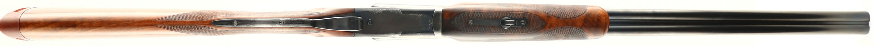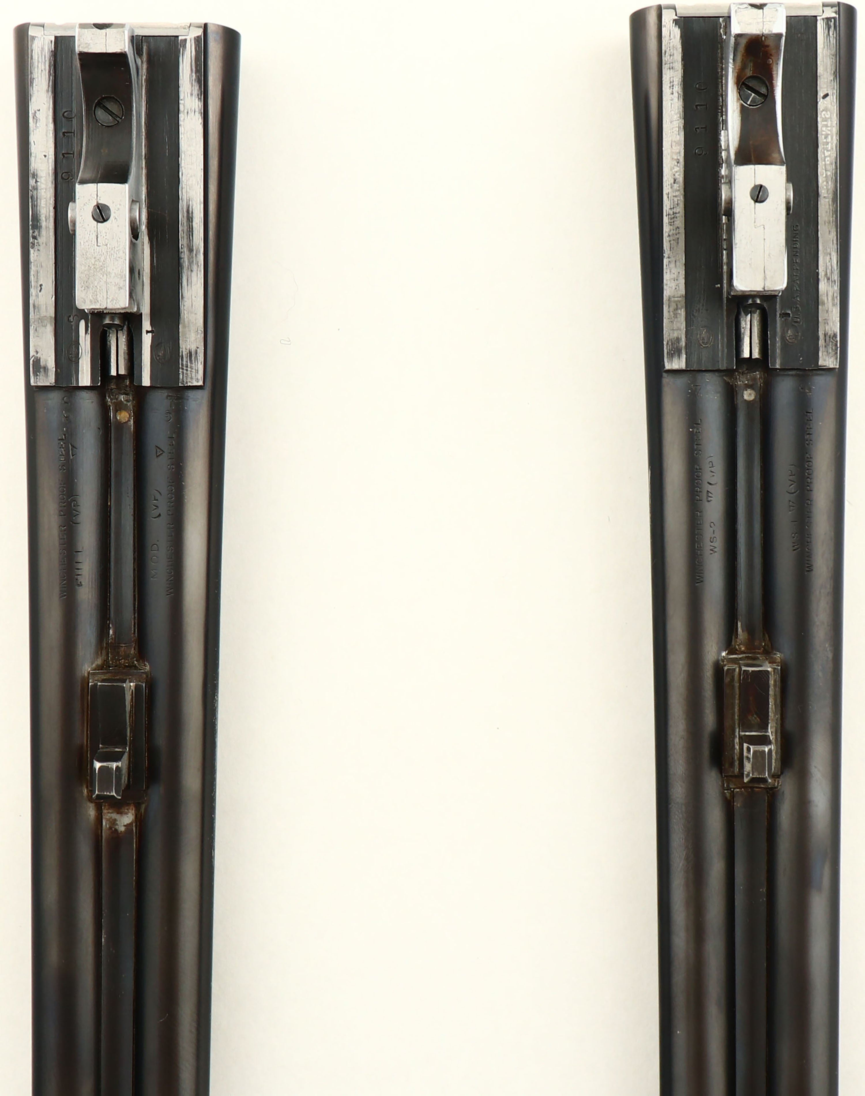 Finish: The original blued finish on the frame rates 95% on the sides/top & 75% on the bottom. The trigger guard rates 50%, with concentrated wear at the handling points. The original blued finish on barrel #1 rates 90%. The original blued finish on barrel #2 rates 95%.