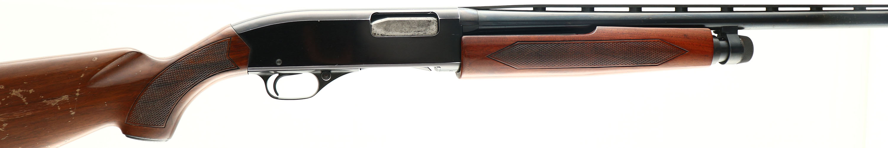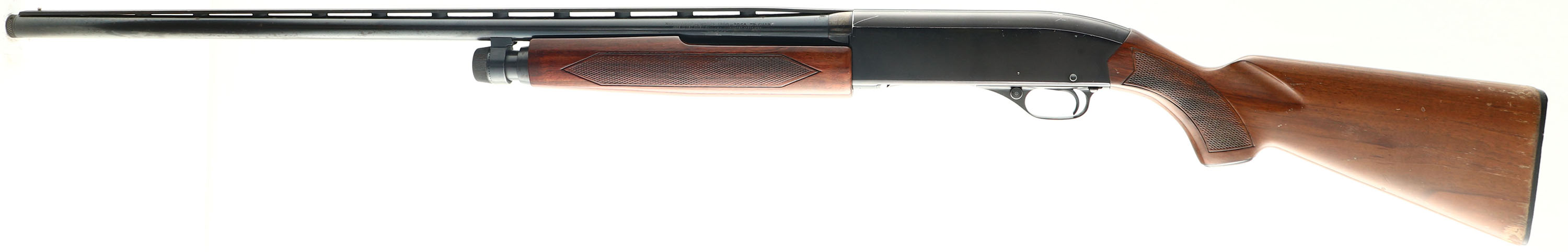 Winchester, Model 1200, CAL: 20 GA, MFG: 1970's-80's, SN: L1257637, Pump Action Shotgun, Choke: Win-Choke System, 2 3/4'' chamber, 28'' barrel w/vent rib. The original checkered & capped pistol grip stocks are very good, with flaking, chipping & thinning of the original finish found mostly on the buttstock. The original blued finish on the barrel rates 90%, but with intermittent spotting & pitting. The ''Japan Black'' finish on the receiver rates 90% toning plum. Bore is excellent, with visible light wear marks. The vent rib holds a single front bead. Stock has a Winchester checkered plastic buttplate. LOP is 13 7/8''. FFL Req. - Value: 250 to 500