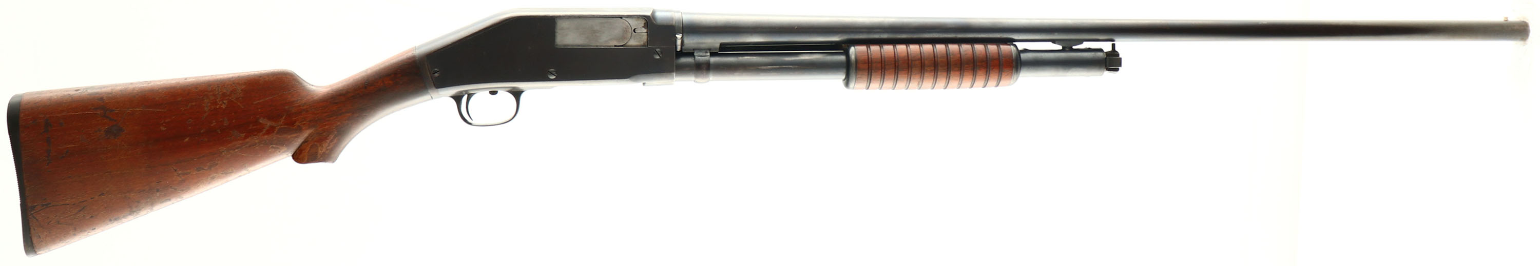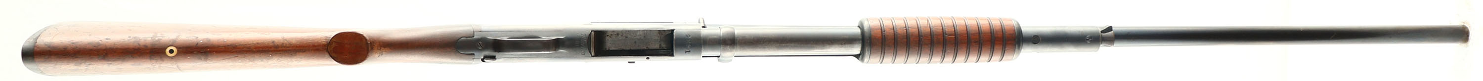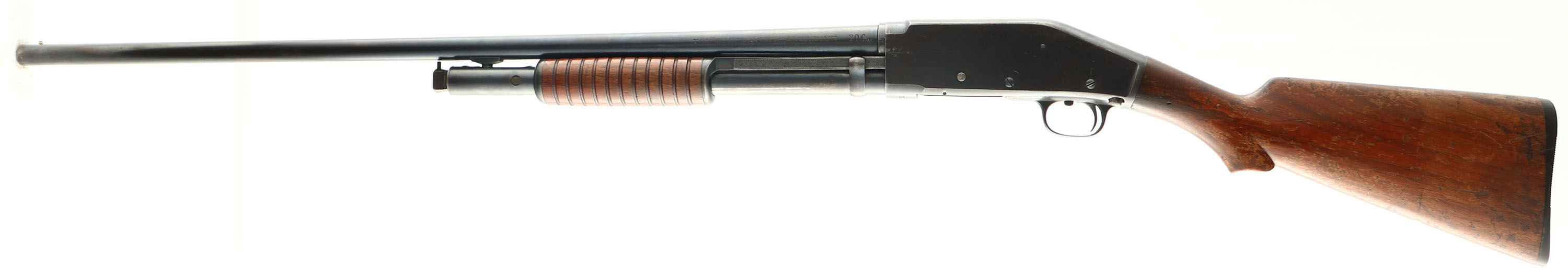 Marlin, Model 44, CAL: 20 GA, MFG: 1922-33, SN: 2291, Pump Action Shotgun, 28'' Matted barrel. The original scalloped pistol grip stock & corncob forend are very good & solid. The finish has flaking, thinning, scrapes, & scratches, with some darkening from oils & use. The blued finish rates 85% overall, with thinning toned to a brown patina. Bore is very good, with striations & visible light wear marks. The matted barrel holds a single front bead. Stock has a grooved plastic buttplate. Trademark bullseye in belly of the stock. LOP 12 3/4''. FFL or C&R Req. - Value: 150 to 250