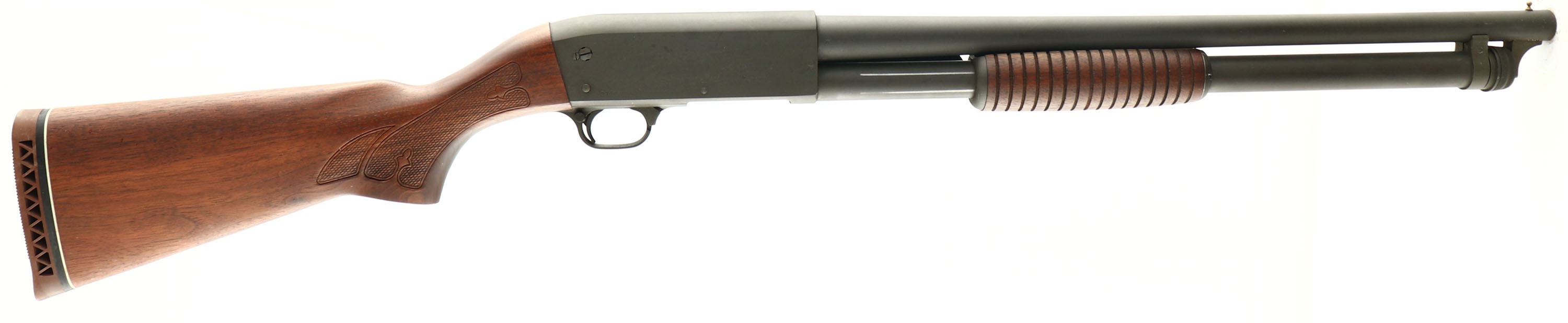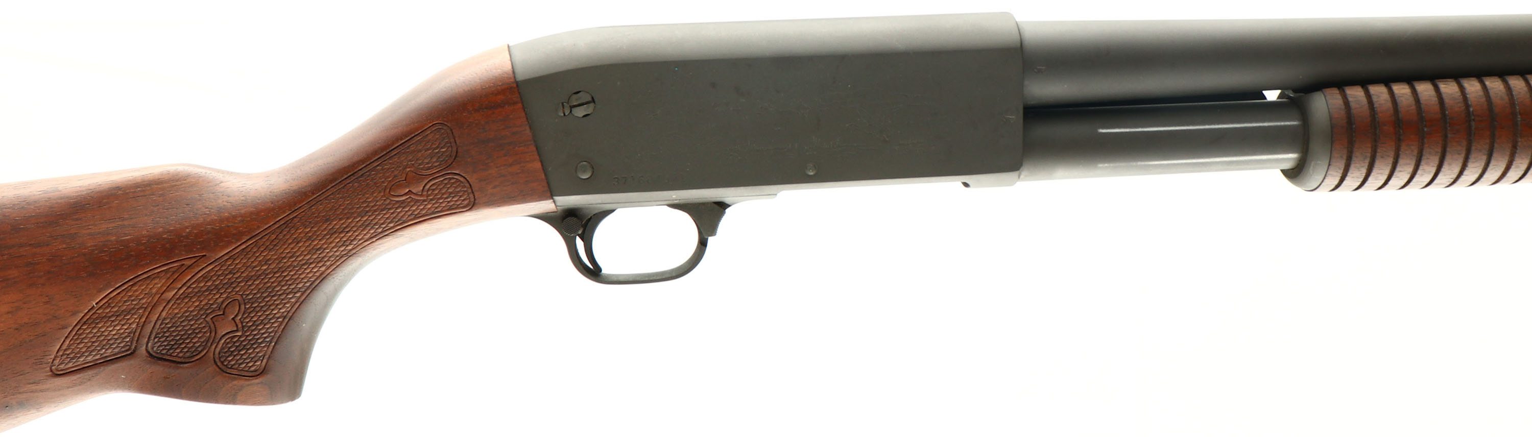 Ithaca, Model 37 Featherlight, Home Defense, CAL: 12 GA, MFG: 1980, SN: 371684971, Pump Action Shotgun, Choke: IC+, 2 3/4'' chamber, 22.5'' barrel. The original checkered & flat pistol grip wood stocks are excellent, displaying little use to the excellent original oil finish. The original metal parkerized, military style finish rates 95% overall. All stampings, markings & engravings are crisp & clear. Bore is excellent. The barrel holds a single front sight. Buttstock carries an Ithaca ventilated recoil pad. 14'' LOP over pad. FFL Req. - Value: 600 to 1000