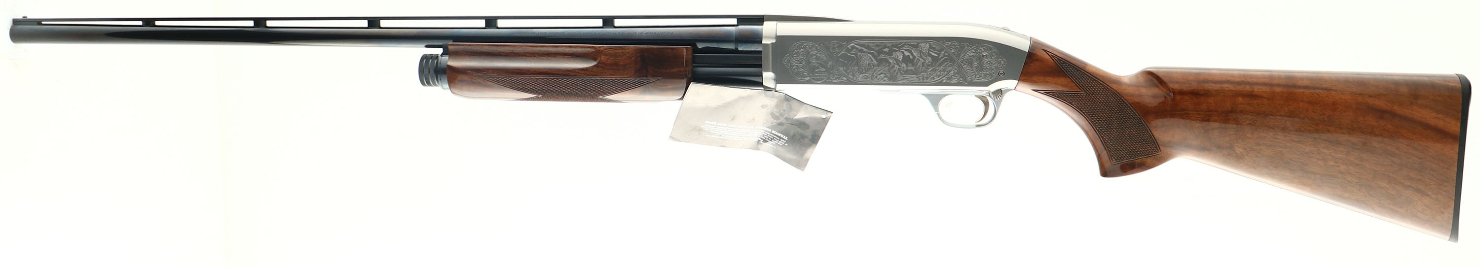 CASED Browning, Model BPS Engraved DU shotgun, 28 Ga., MFG. Modern, SN: 0814DU20021, Pump Action Shotgun, made in Japan, 26'' Matted Vent Rib barrel, take down, Interchangeable invertor choke tube system with all three chokes, 2 3/4'' shells, High grade walnut glossy checkered stocks are near Mint, with flat knob pistol grip, factory black butt plate, Metal blue is 100%, with distinctive silver engraved receiver that pictures Mallards setting in on both sides, Bore is mint, NIB, bright & shiny, Bottom eject (great for left or right handed shooters), Thumb safety, 14 1/8'' LOP, Comes with correct factory box with lock, wrench & paperwork, Here is your chance to buy a Mint 28 Gauge PBS that has been out of production for 23 yrs. FFL Req. - Value: 1000 to 2000