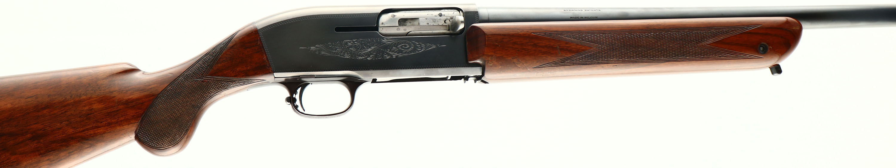 Browning (Belgium), Model ''Twelvette'', CAL: 12 GA, MFG: 1955-71, SN: C11748, Double Automatic Shotgun, 29 1/2'' barrel. Full Choke, The original checkered round knob pistol grip wood stock & forend are excelelnt, with several minor to small scrapes or contusions to the high gloss finish. The original metal blue finish rates 95% overall. The receiver displays scroll hand engravings. Bore is excellent & bright. The barrel holds an elevated front bead. Buttstock carries the John Browning portrait plastic buttplate with very small chips to toe. Sling studs. Approximately 67,000 Double Autos were produced, so fairly limited production & becoming very collectible today. A very nice original example & collector grade. FFL or C&R Req. - Value: 1000 to 1500