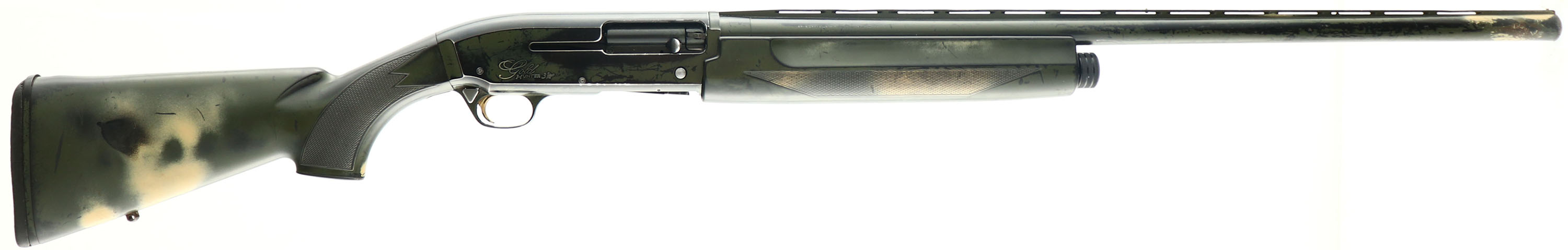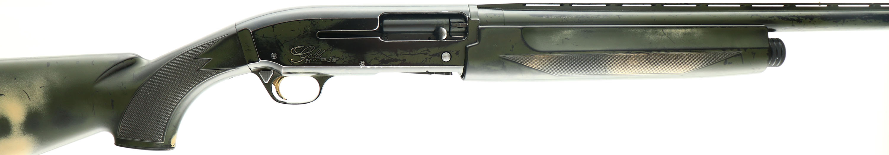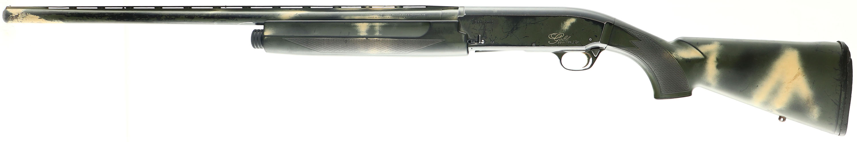 BROWNING, Model Gold Hunter, 12 GA. MFG. 2000, SN: F01NP06351, Semi-Auto, Made in Belgium, 3 1/2'' Invector Plus, 28'' matted ventilated ribbed barrel, camo painted plastic checkared stocks with flat knob pistol grip is very good, Metal is handed painted camo but looks to be in good condition, Bore is very good, after market solid buttpad shows wear, gold trigger, Safety at rear of the trigger, has selector switch for taking out one duck load & slipping in a goose load, 13 7/8'' LOP over pad. FFL Req. - Value: 300 to 600