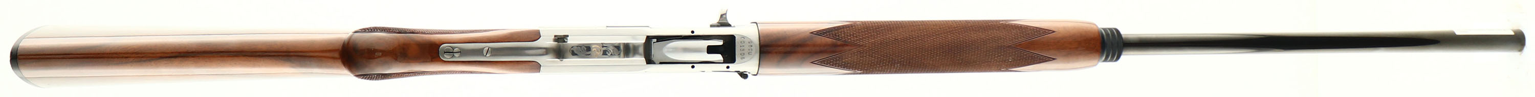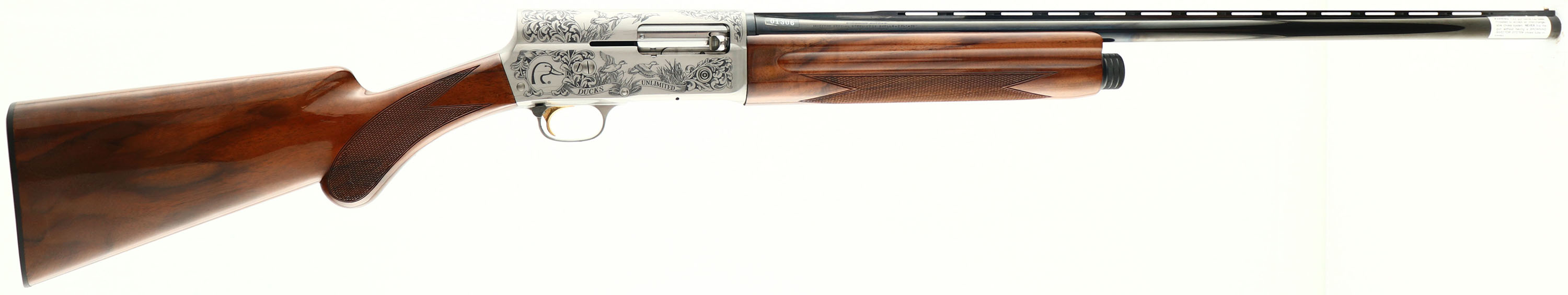 Cased Browning, Auto-5 Ducks Unlimited Light Twenty CAL: 20 GA, MFG: 1990, SN: 90DU001306, Semi-Auto Shotgun, Invector Choke System, 2 3/4'' chamber, 26'' Ventilated matted ribbed barrel. Ducks Unlimited Special Edition. The Miroku factories in Japan built 5,000 of these Auto-5's. Featuring elaborately engraved silver coin receiver & fancy checkered walnut stocks. The words ''DUCKS UNLIMITED'' & ''LIGHT TWENTY'' are engraved in banners across the sides of the receiver, along with numerous ducks in hunting scenes. Engraved trigger guard. Engraved & signed by T. NAGANOI. Both wood & metal finishes are as excellent. Bore is excellent. Barrel holds a single front bead. Buttstock carries Browning buttplate. Gold Trigger. Never shot. Has all choke tubes, wrench and paperwork, Sticker still on barrel. 14'' LOP. Excellent DU & Browning collectible.* FFL Req. - Value: 1400 to 2400