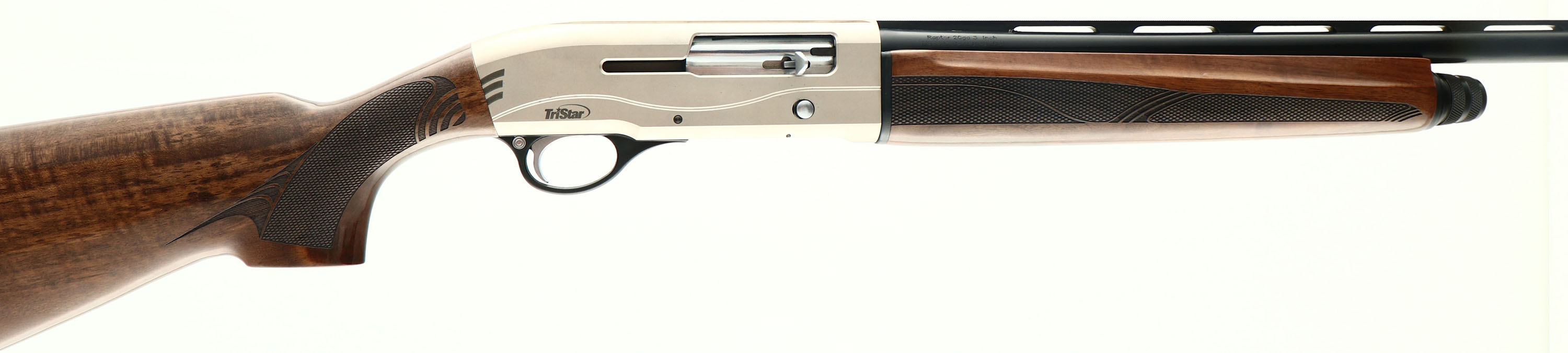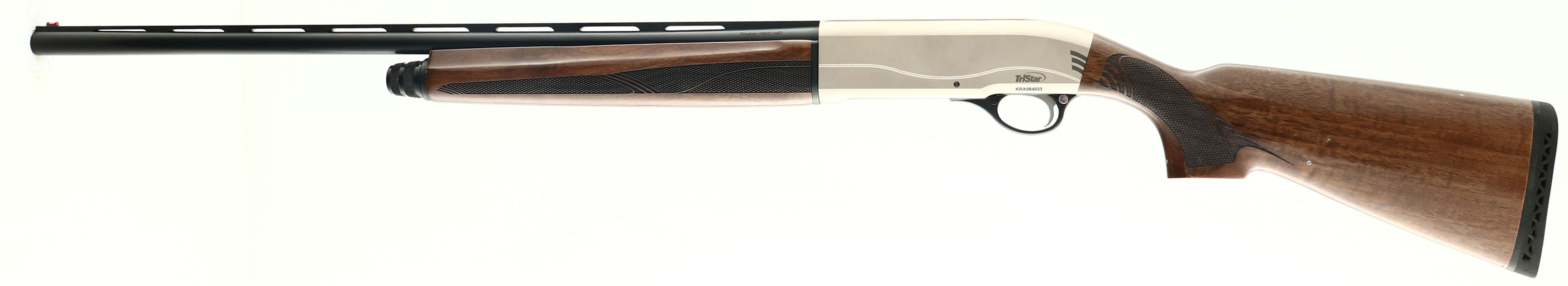 TriStar, Model Raptor Walnut, CAL: 12 GA, MFG: Modern, SN: KRA084033, Semi-Auto Shotgun, Screw-in choke tube, with a MOD choke installed, 3'' Chamber, 26'' Ventilated barrel. The original checkered & flat pistol grip wood stocks are excellent, with few tiny handling marks to the original finish. The original metal blue finishes on barrel rates 98%. The satin silver receiver, rates excellent. Bore is excellent. Red bar fiber optic sight on the matted rib. Buttstock carries the original ventilated recoil pad. LOP: 14 1/8'' overpad. Excellent overall, FFL Req. - Value: 250 to 400