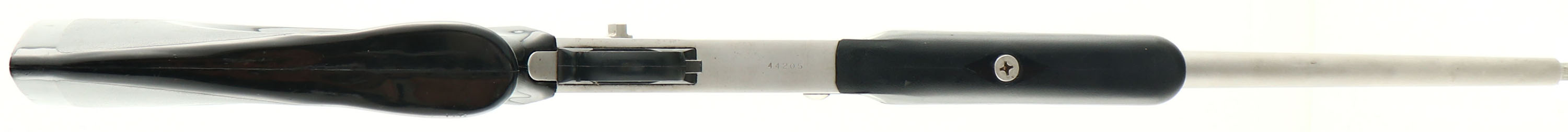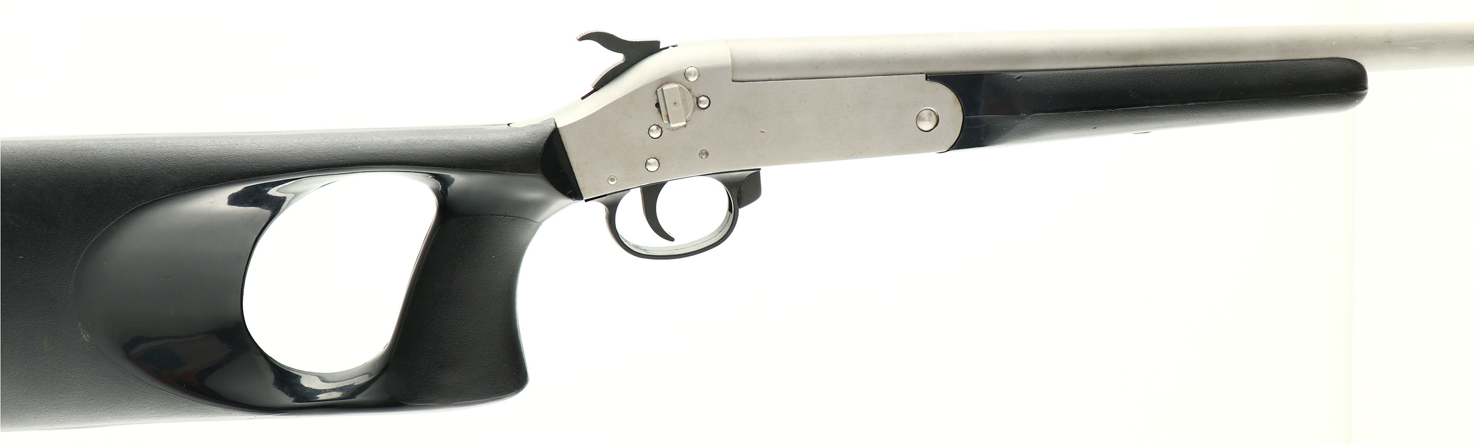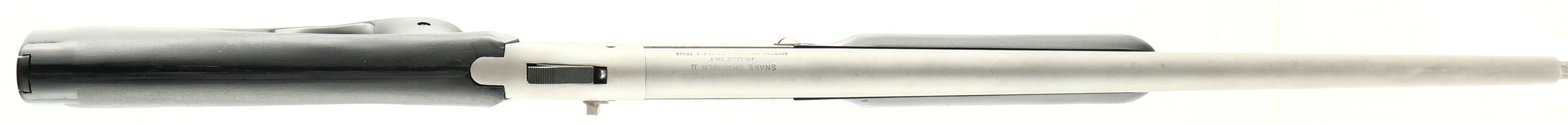 H. Koon Inc, Model: Snake Charmer II, Single break shotgun, Caliber: .410, Barrel Length: 18 1/8'', S/N: 44205, The Snake Charmer designed by Homer ''Jeff'' Koon of Dallas, Texas was intended to be an easy to carry & effective weapon for ranchers, fisherman, or anyone else that may stumble upon venomous snakes lurking in the swamps & pastures of the southern states. The gun that he created is a lightweight (just 3.4lbs), single shot break-action .410 Bore shotgun, measuring only 28 1/2'' long. The original thumbhole synthetic stock remains very nice, with minor scuffs or scratches. The stainless satin silver barrel & receiver are excellent, Bore is excellent. No open sights. Slide cover in buttend houses storage for 4 cartridges, slide is loose. FFL Req. - Value: 150 to 250