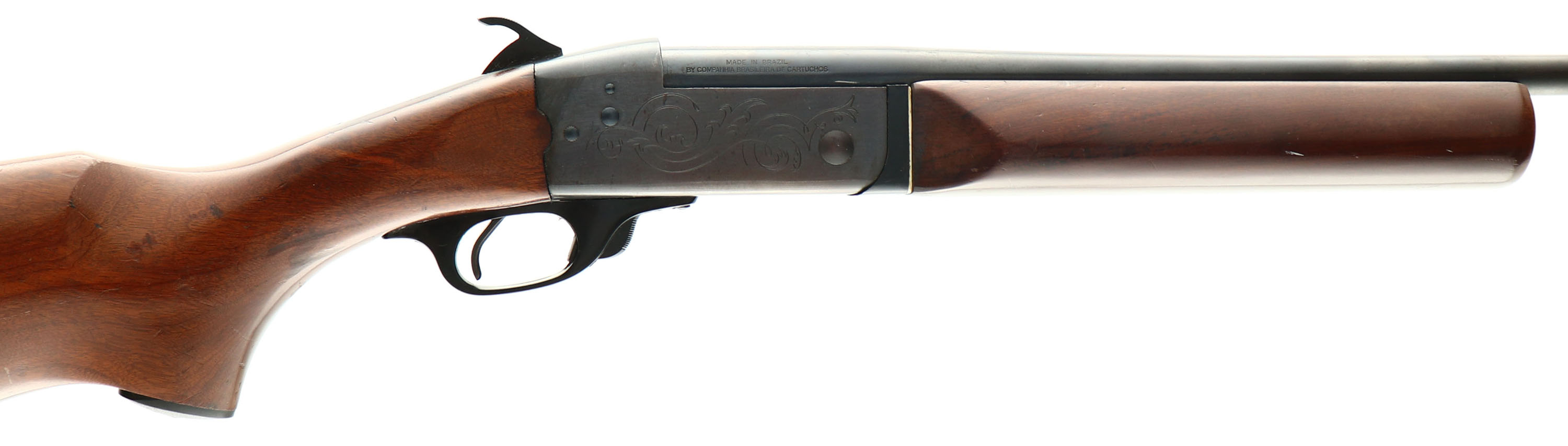 Companhia, Model SB, CAL: 410 GA, MFG: Modern, SN: C964794, Break Action Single Shot Shotgun, 26'' barrel. Brazilian made & imported by Firearms Import & export. The flat capped pistol grip wood stocks are excellent, with small finish level contusions & surface scrapes. The metal blue is 90% on barrel & 60% on receiver. Bore is excellent. The barrel carries a single front bead. Buttstock carries a factory buttplate. Nice utilitarian .410 shotgun. FFL Req. - Value: 100 to 300