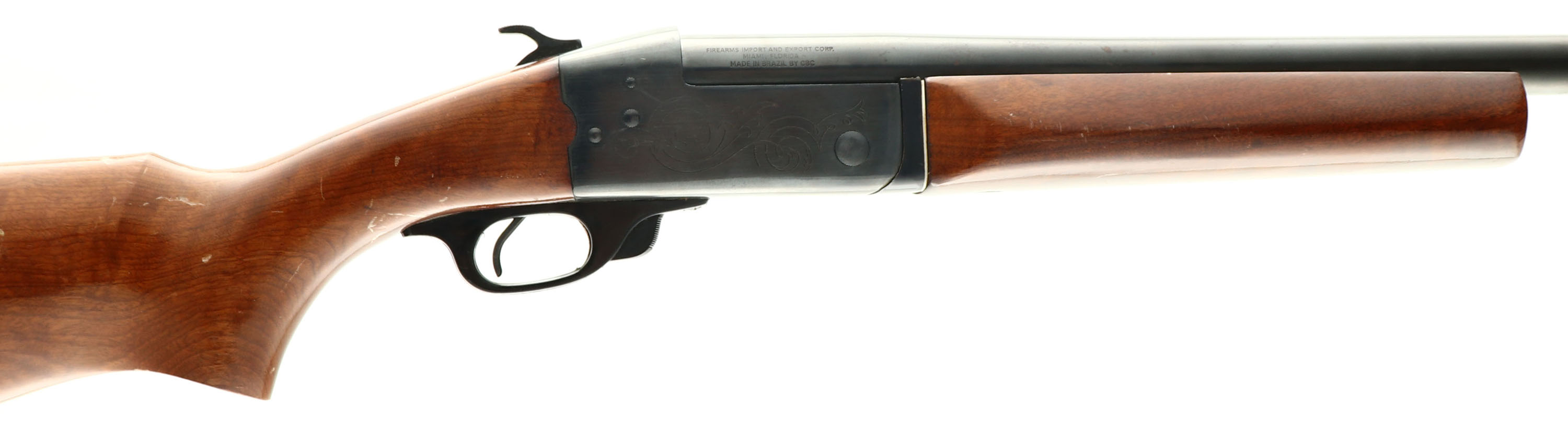 Companhia, Model SB, CAL: 12 GA, MFG: Modern, SN: C1069566, Break Action Single Shot Shotgun, 28'' barrel. Brazilian made & imported by Firearms Import & export. The flat capped pistol grip wood stocks are excellent, with small finish level contusions & surface scrapes. The metal blue is 95% overall. Bore is excellent. The barrel carries a single front bead. Buttstock carries a factory buttplate. Nice utilitarian 12ga shotgun. FFL Req. - Value: 100 to 300