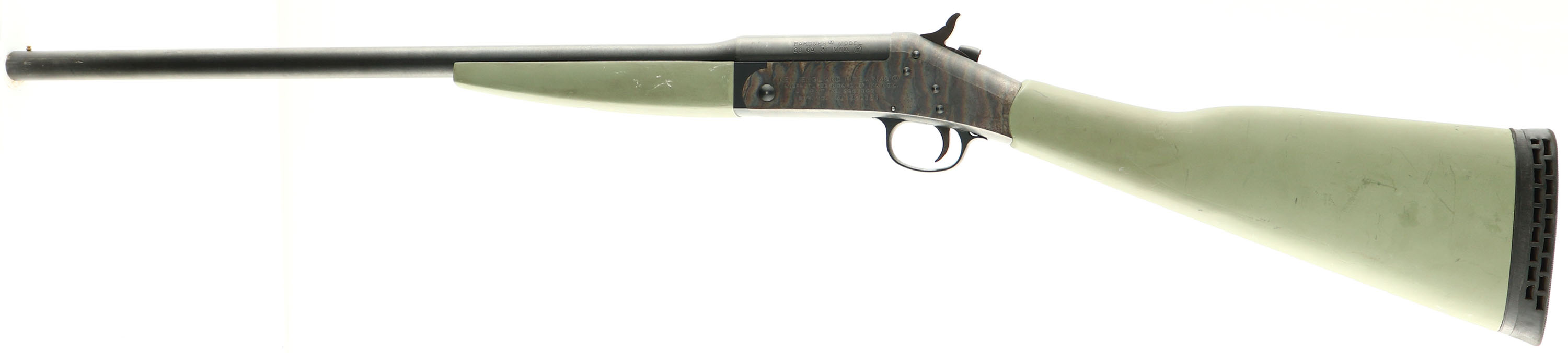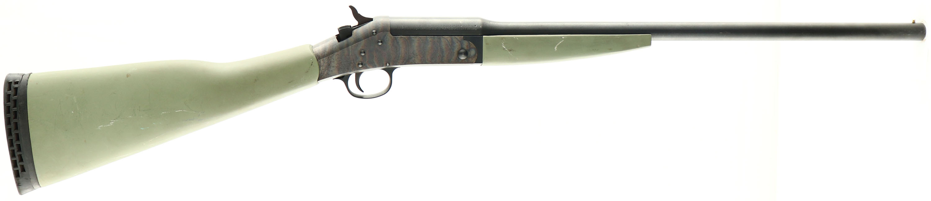 New England Firearms Co, Model Pardner, CAL: 20 GA, MFG: Modern, SN: NU320323, Break Action Single Shot Shotgun, Chamber: 3, Choke: MOD, 22'' barrel. The flat pistol grip wood stock & forend are very good, carrying a light flat green paint finish. The are several minor to small rubs & scrapes. The metal blue finish rates 95% overall, The receiver displays attractive case-colors. Bore is excellent. The barrel holds a single front bead. Buttstock carries a ventilated recoil pad. FFL Req. - Value: 150 to 250