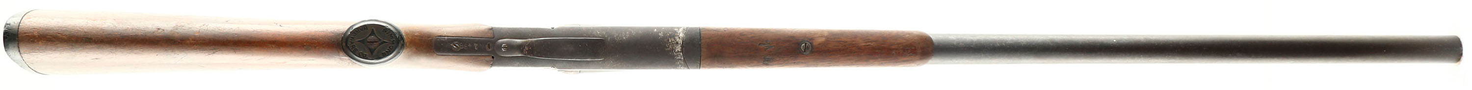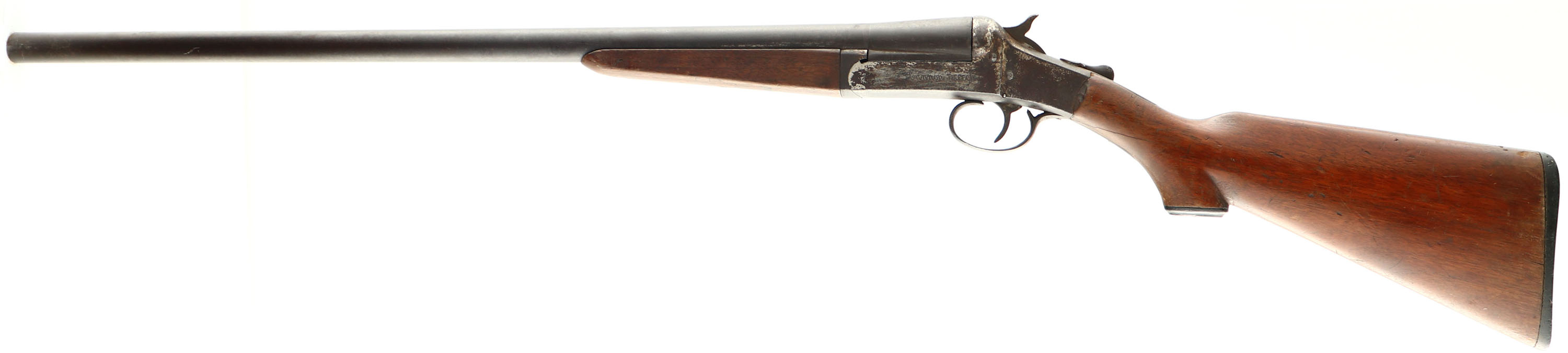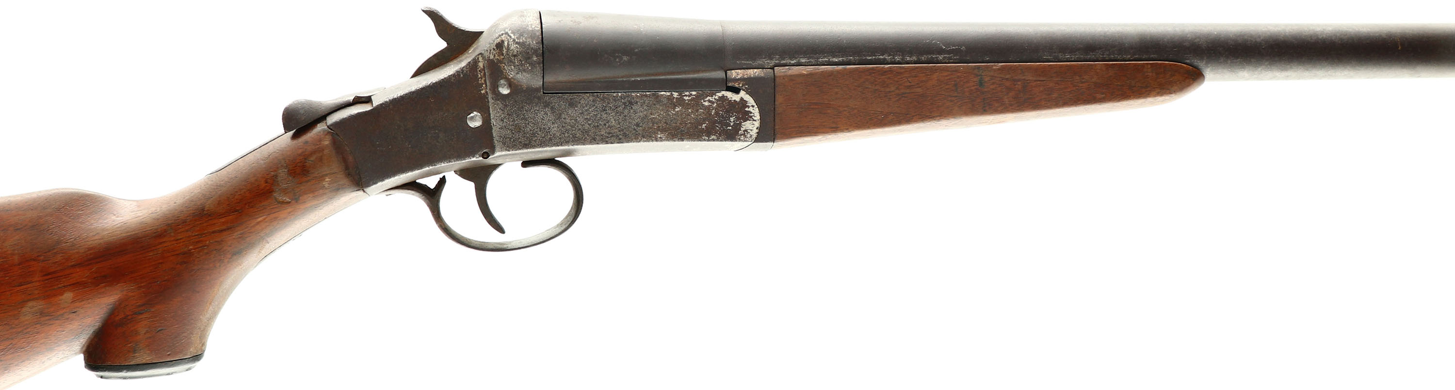 Simmons Hardware Co. (Hopkins & Allen), Model Cannon Breech Single Break Shotgun, CAL: 12 GA, MFG: 1910, SN: N1468, MOD, 27 3/4'' barrel. The original capped pistol grip wood stocks are good & solid, despite a 3'' stress crack on the left side of the wrist. There are numerous contusions, scrapes, nicks & scratches to the thin & worn original finish. The metal finish has worn & toned to a brown patina. The nickeled receiver has also worn to a brown patina, with some remnants of nickel. Bore is good, but with some spots of cleaned roughness. No bead on barrel. Buttstock carries a Simmons black plastic buttplate. FFL or C&R Req. - Value: 80 to 150
