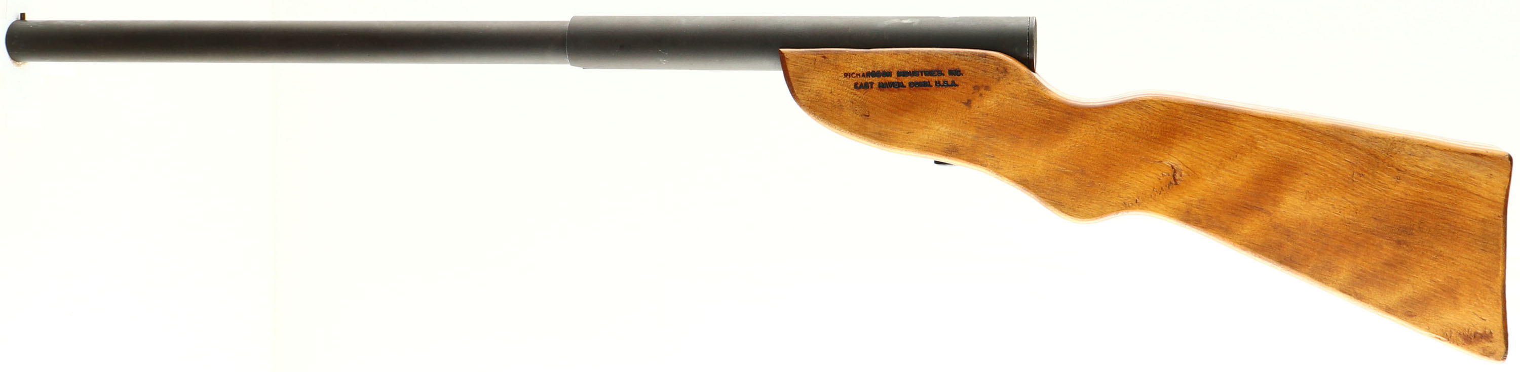 Richardson Industries, Guerilla Gun, CAL: 12GA, MFG: Pre 1968, SN: NONE, Slam Fire Shotgun, 23'' barrel. The left side of the stock is marked ''RICHARDSON INDUSTRIES IN EAST RIVER CONN U.S.A'' & the right side is marked ''GUERILLA GUN PATENT PENDING''. No markings on the metal. The wood stock is very good & solid. The matte finish on the barrel/receiver rates 85%. Bore is good, with consistent roughness. Post front sight. No buttplate. Based on the design of Philippine homemade fighting shotguns, these guns were introduced to the market following World War II, but never caught on. FFL or C&R Req. - Value: 400 to 800