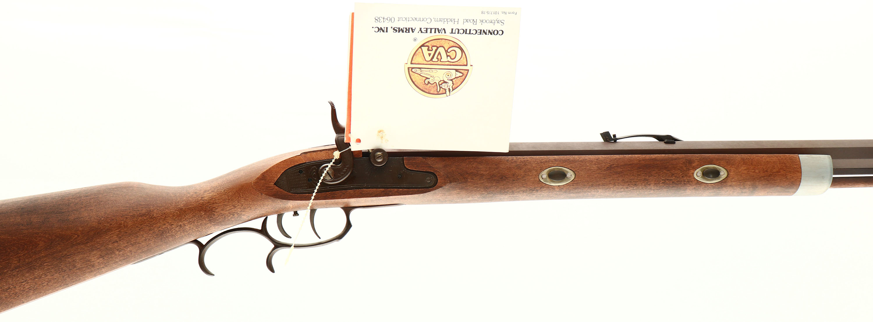 BOXED, CVA, Mountain Rifle, CAL: 50, MFG: N/A, SN: 0080995, Single Action Percussion Rifle, 32'' octagon barrel. Factory markings on barrel. The cheeked straight grip wood stock is excellent. The browned finish is excellent. Bore is excellent. Adjustable rear sight & blade front sight. Crescent metal buttplate. Comes in factory box, with original hang tags still attached. Blackpowder, No FFL Req. - Value: 150 to 250
