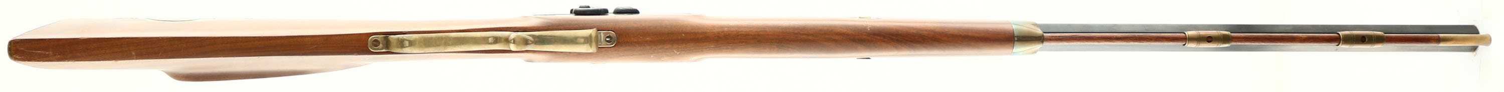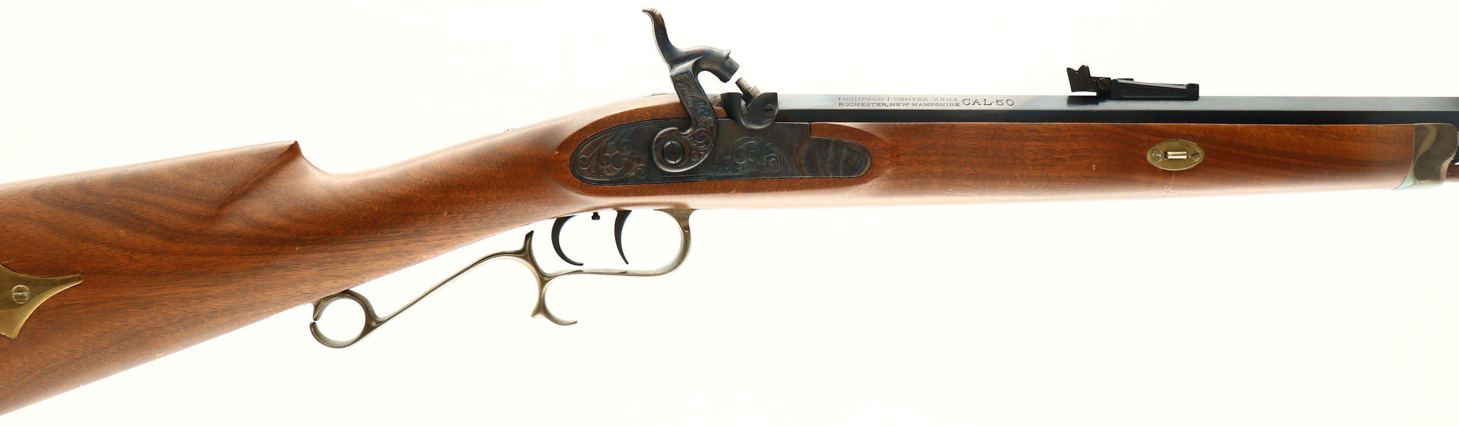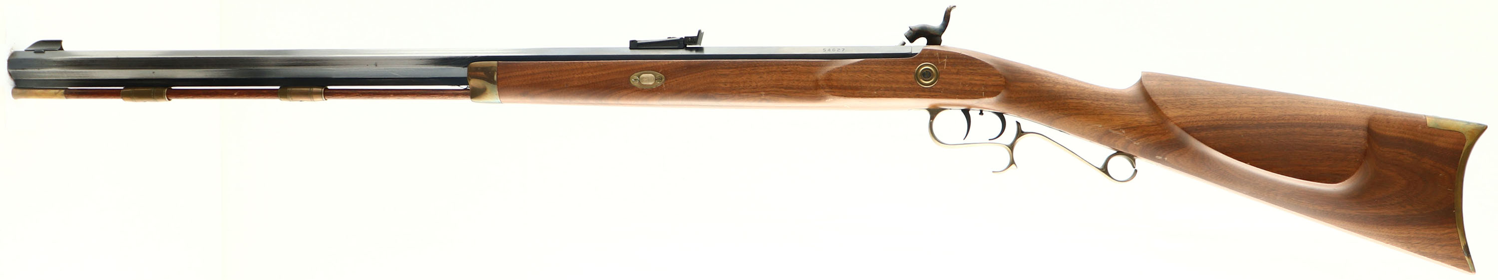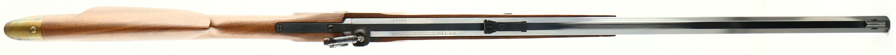 Thompson Center Arms, Muzzleloader, CAL: 50, MFG: N/A, SN: 54627, Percussion Muzzleloader, 28'' octagon barrel. Factory markings on barrel. The cheeked straight grip wood stock is excellent. There are some minor scrapes to the finish. The blued finish on the barrel rates 70%, with concentrated wear to the left side. The case-hardned side plate & hammer retain visible, but faded case-colors. Brass hardware has some spotting & haze. Bore is excellent. Adjustable rear sight & blade front sight. Crescent metal buttplate. Double set-triggers. Blackpowder, No FFL Req. - Value: 100 to 200
