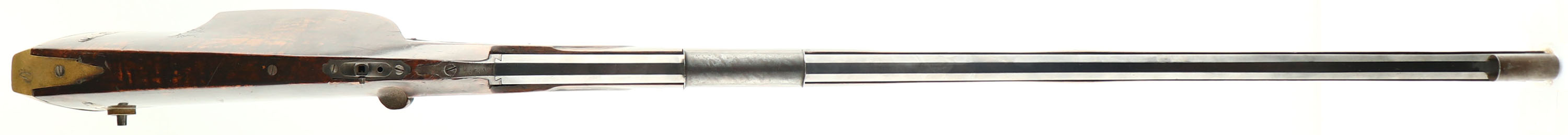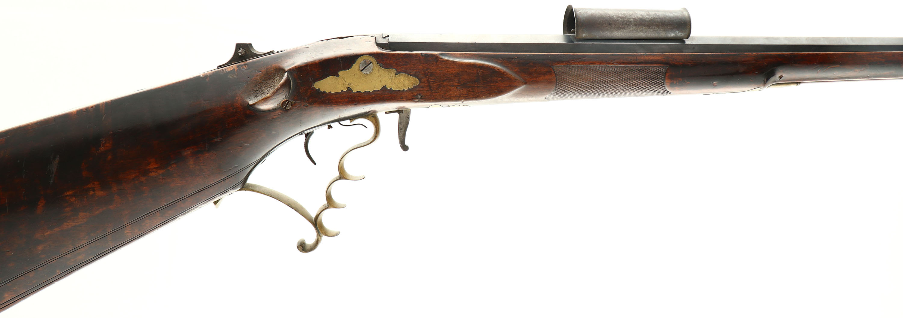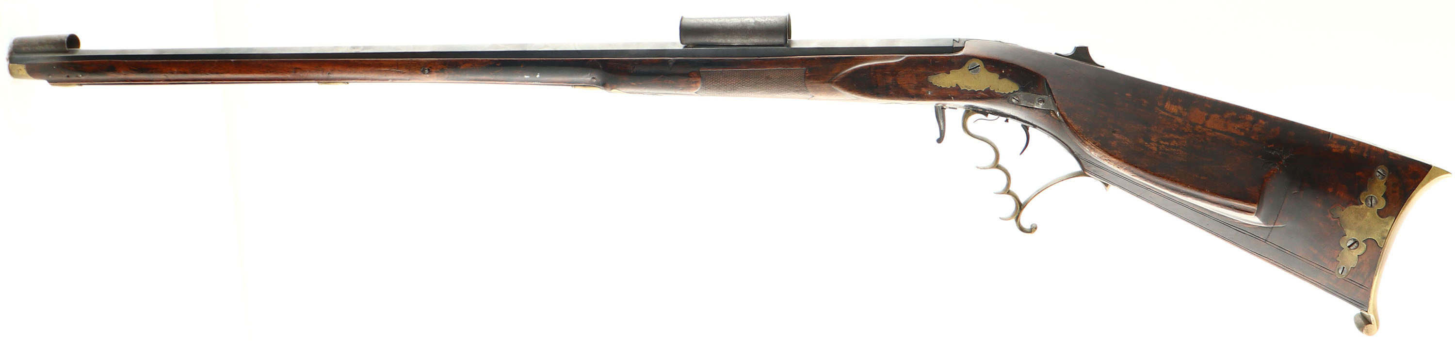 CONDITION: The checkered walnut stock is good with various small nicks, dings, scuffs & scratches from use/age. There is a 2'' crack in the belly of the stock. Two chip repairs on the left cheek of the stock, &a couple cracks at the tip of the forend with nail reinforcement. The barrel has been re-blued with light roughness under the finish. The finish on the barrel rates 97% with only a couple small spots of wear/patina. The barrel tang has toned to a mix of gun metal gray & brown patina. The brass parts all exhibit patina. The upper extension of the buttplate is marked with a script letter symbol. The bore is excellent, bright & shiny, smoothbore. The barrel has a brass bore sleeve, unknown if its original or if its been sleeved. The barrel holds a small, beaded post front sight with a large hood protector, & a small V-notch rear sight with another large hood protector. The wrist has a mount for a tang sight. The stock carries a brass buttplate, has a few dings & light patina. gun has no sling mounts, & has a stick in the ramrod channel. Antique/Airgun, No FFL Req - Value: 800 to 1600