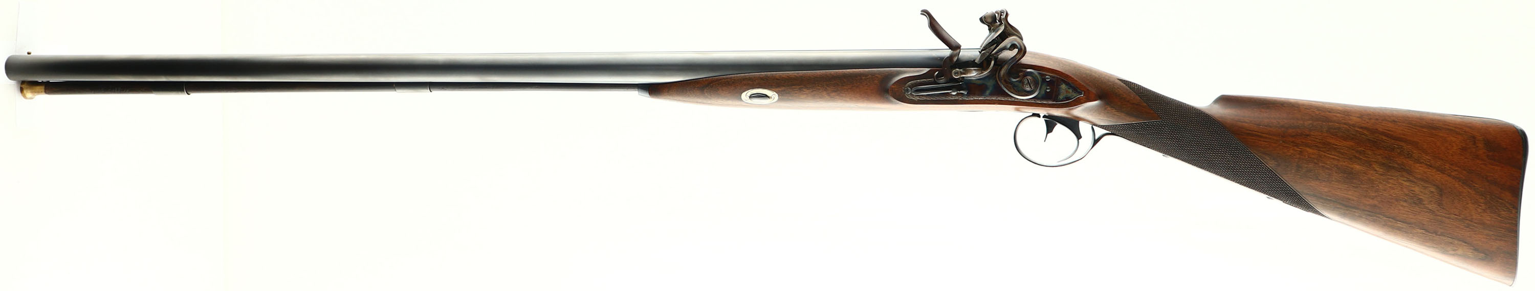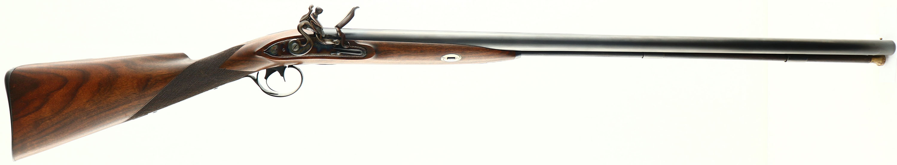 Stan Cherubin, Double Flintlock Shotgun, CAL: 12 BORE, MFG: 2008, SN: 28, Flintlock Muzzleloader SxS, 30 1/2'' barrels. This gun was custom built in 2008 by Stan Cherubin. Cherubin has been a gunmaker since 1974. Included with this gun is a breif history of Cherubin & how he came to be a gunmaker. This shotgun is compiled of modern parts & finishes to best replicate & recreate the look & style of the originals. The beautiful English Walnut checkered straight grip stock is excellent. The original finish is excellent. The metal finishing was done by Doug @ Turnbull Company. The blued finish on the Mossberg barrels is excellent. There is a single gold inlaid strip 1/4'' from the stock. Under the barrels is engraved ''C.LINDSEY M'TOWN CYL/CYL 9531''. The Durs Egg flintlock systems are case-hardened, retaining vivid case-colors. Durs Egg was a master English gunmarker. These are copies of an original flintlocks featuring a waterproof pan, pierced bridle, fly in the tumbler, stirrup typer mainspring & a roller mounted frizzen on an internally polished plate. They measure 5'' x 15/16'' with the recommended flint size being 3/4''. The solid rib holds a single brass bead. Stock has a smooth blued metal buttplate. Double triggers. Ramrod present. A gorgeous hand crafted shotgun. - Value: 3000 to 5000