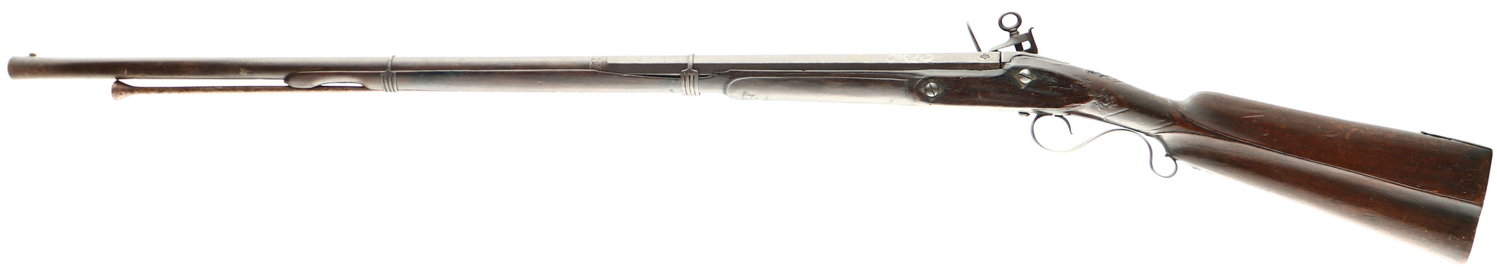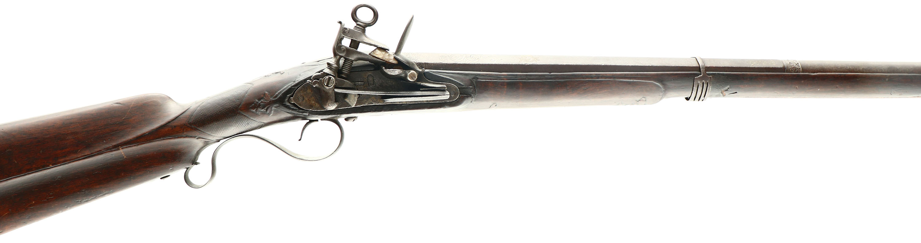 Spanish, Americas Colonial era Escopeta (shotgun), Cal: .73 (18.5mm), MFG: 1700s- early 1800s, S/N: None, Flintlock musket, 34 7/8'', Half octagon, Half round barrel, barrel flares out at the muzzle.