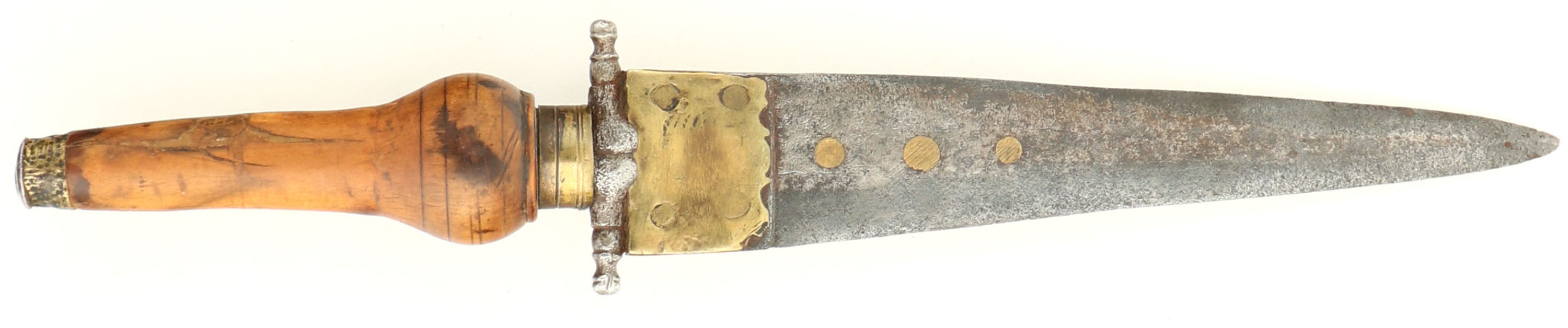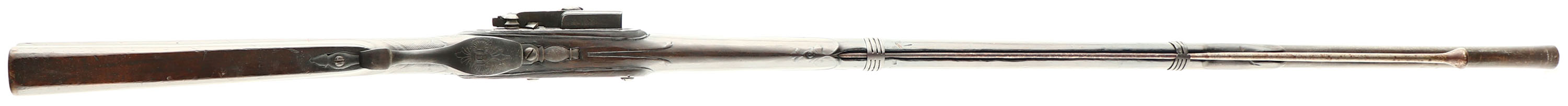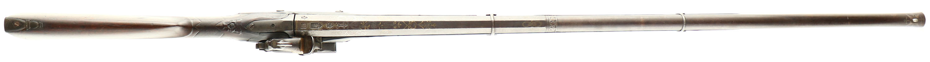 CONDITION: The straight wrist, checkered walnut stock is good with nicks, dings, dents, chips & small cracks from use/age. Chunk of the stock gone on the left side of the forend, by the rear barrel band, 1 1/4'' crack at the back of the chip. Small chip just in front of the lock. There is a crack at the rear of the lock & one on the top of the wrist. Metal is proud to the wood around the buttplate & upper wrist tang. The checkering on the wrist is heavily worn, but still present. The whole stock is carved & styled with beautiful floral designs, edges & designs are worn from rubbing & use wear. The metal has toned to a brown patina with light roughness at the rear of the barrel & on the lock. The barrel has intricate decorative engravings with gold/silver inlays. The rear of the barrel is marked with Eibar Spain & Spanish Armory proofs, please look at the photos provided for a close up of the proofs. Tombstone proof on the barrel reads ''P D'' over ''DOIS'' over ''TUA'', the tombstone proof on the lock plate reads ''USA'' over ''TO'' over ''??'', last markings too worn to read. The barrel is marked with three Fleur-de-lis marks, a cross symbol, & lion in a square proof. The front sight has a spider metal inlay with cross symbols on each side. The bottom of the trigger guard has more decorative engravings with a tombstone stamp in the middle that reads ''TSA'' over ''TO'' over ''??'' bottom markings too worn to read. The trigger guard tangs & upper buttplate extension are shaped/styled decoratively. Trigger guard forms a semi-pistol grip on the wrist. The forward barrel band has two of the four forks broken, the other two are thin from rust wear. The bore is fair, its bright with roughness & some spots of pitting. The barrel holds a bead front sight. The stock carries a metal, half size buttplate, covers the top half on the rear & wraps around the top. Buttplate has roughness/pitting. Gun does not have sling mounts. The gun does have a iron ramrod. Comes with a period correct plug bayonet. These are inserted into the muzzle for use & was common for Spanish hunting guns of this time. Bayonet has no markings, has roughness on the blade. Antique/Muzzleloader, No FFL Req - Value: 2000 to 5000
